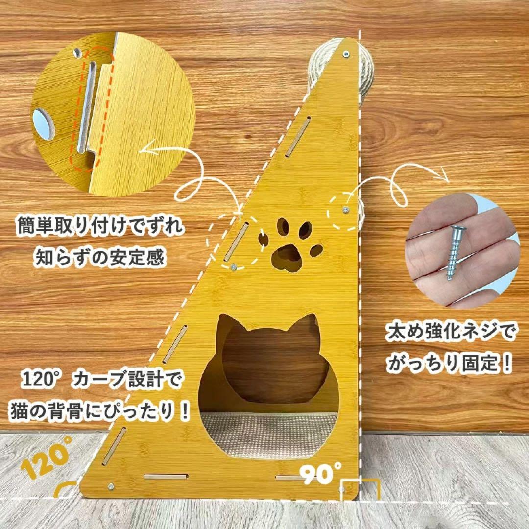 ●商品説明 ・天然素材の麻、ロープ使用、縦型、猫爪とぎ、省スペース ・麻ロープ製、三角爪とぎ、本格的な高耐久設計 ・三角構造で分厚く安定性抜群 ・両面使用可能。表裏どちらも爪とぎ対応。 ・付属のおもちゃは、取り外して別々に遊べる。新しい遊び方が発見できる。 ・本能で穴くぐり大好き。一緒にかくれんぼ遊び。 ・簡単に取り外し可能。洗濯可能なサイザル麻パッド。 ・厚めタイプ。滑り止め仕様。 ・ネジで固定する猫爪とぎが欲しいと言うお客様のご要望を実現しました。すべてネジ固定の新生モデル、ここに進化ネジ止めが可能にする驚くべき安定感。 ・完全なネジ固定愛猫が飛びついてもびくともしない安定感です。爪とぎからお昼寝スポットへそのまま猫の居場所になるネジは強度を高める太め設計です。初回ご利用時は希望にまっすぐに当てゆっくりと確実に回し込んでください。そうすることでスムーズで固定できます。 ・簡単取り付けでずれ知らずの安定感。120度カーブ設計で猫の背骨にぴったり。太め強化ネジでがっちり固定。 ・猫じゃらしボールは、木の棒に簡単装着、バラバラで置いても3つまとめても楽しく遊びます。厳選した天然木スティックで頑丈で長持ちします。