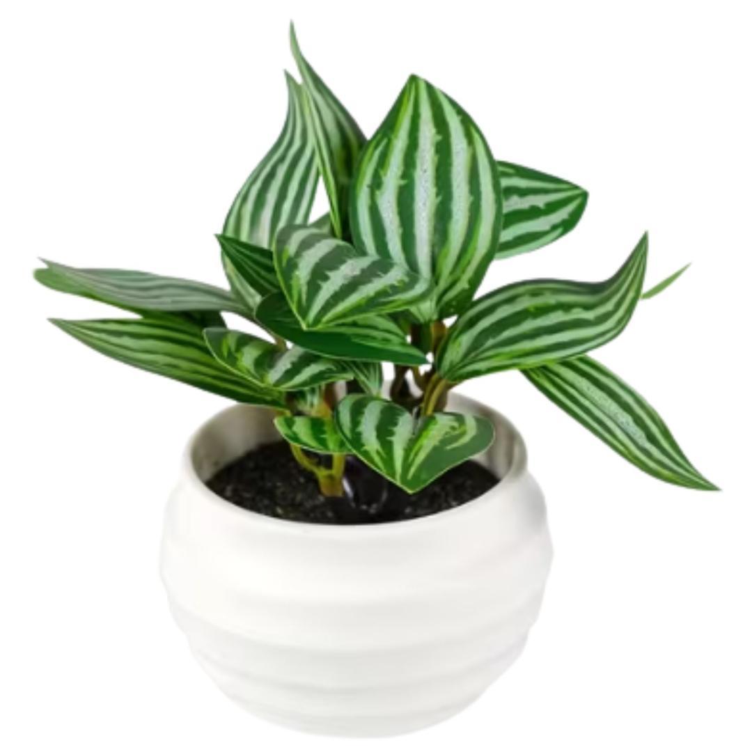フェイクグリーン ストライプ模様の葉を持つ 鉢植え人工観葉植物、植物が映えるスタイリッシュな白いポットも魅力的です。