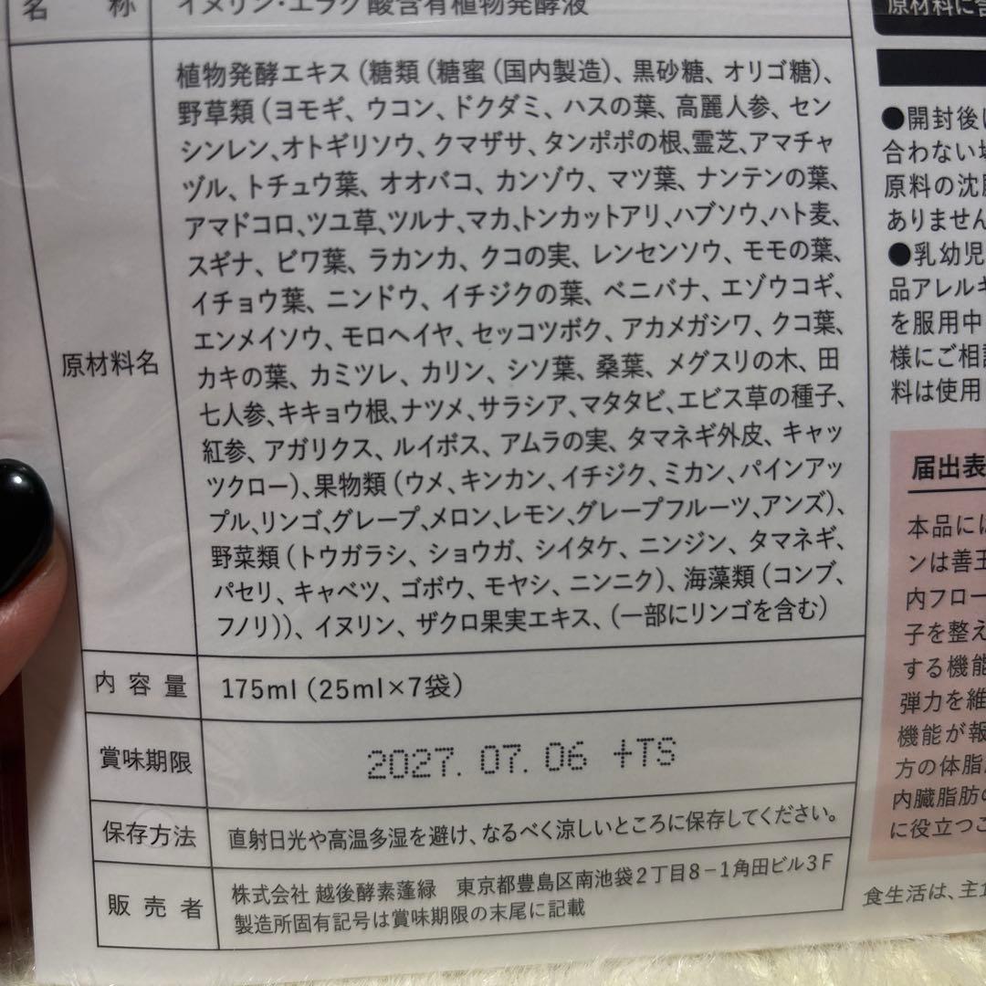 - 原材料: 植物発酵エキス(穀物(国内産)・野菜・果実・海藻・キノコ・ハーブ等)・水・甘味料(ステビア)・酸味料・香料・ビタミンC・フルーツ・イタリアン・ザクロ果実エキス