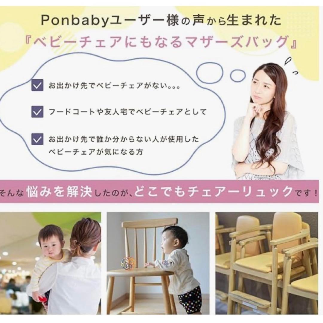 【Ponbabyユーザー様の声から生まれたどこでもチェアーリュック】ベビーチェアにもなる!容量13Lの持ち運びしやすいマザーズバッグ。お出かけ先でベビーチェアがない。。。フードコートや友人宅でベビーチェアとして。。。マザーズバッグがベビーチェアに大変身!首、腰が据わった7ヶ月頃~4歳頃までのお子様にご使用いただけます。