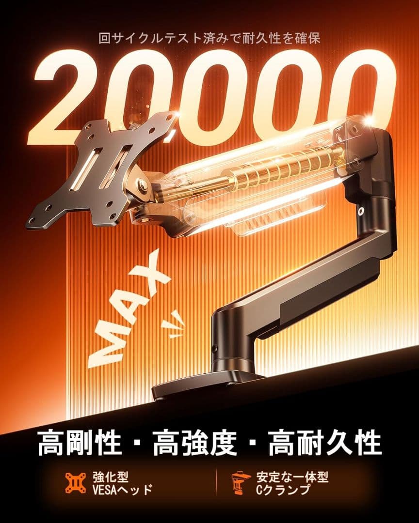 【40%広がったVESAヘッドで圧倒的な安定性】従来モデルよりも剛性を高めたVESAヘッドを採用しました。VESAヘッドのベアリング(軸受)面積を40%を広幅化により、モニターアームを伸ばした際に発生しやすい「たわみ」現象を効果的に抑制します。ディスプレイアームの長時間使用による緩みや自然落下の心配がなく、タイピングや画面タッチ時の嫌な揺れも大幅に低減します。