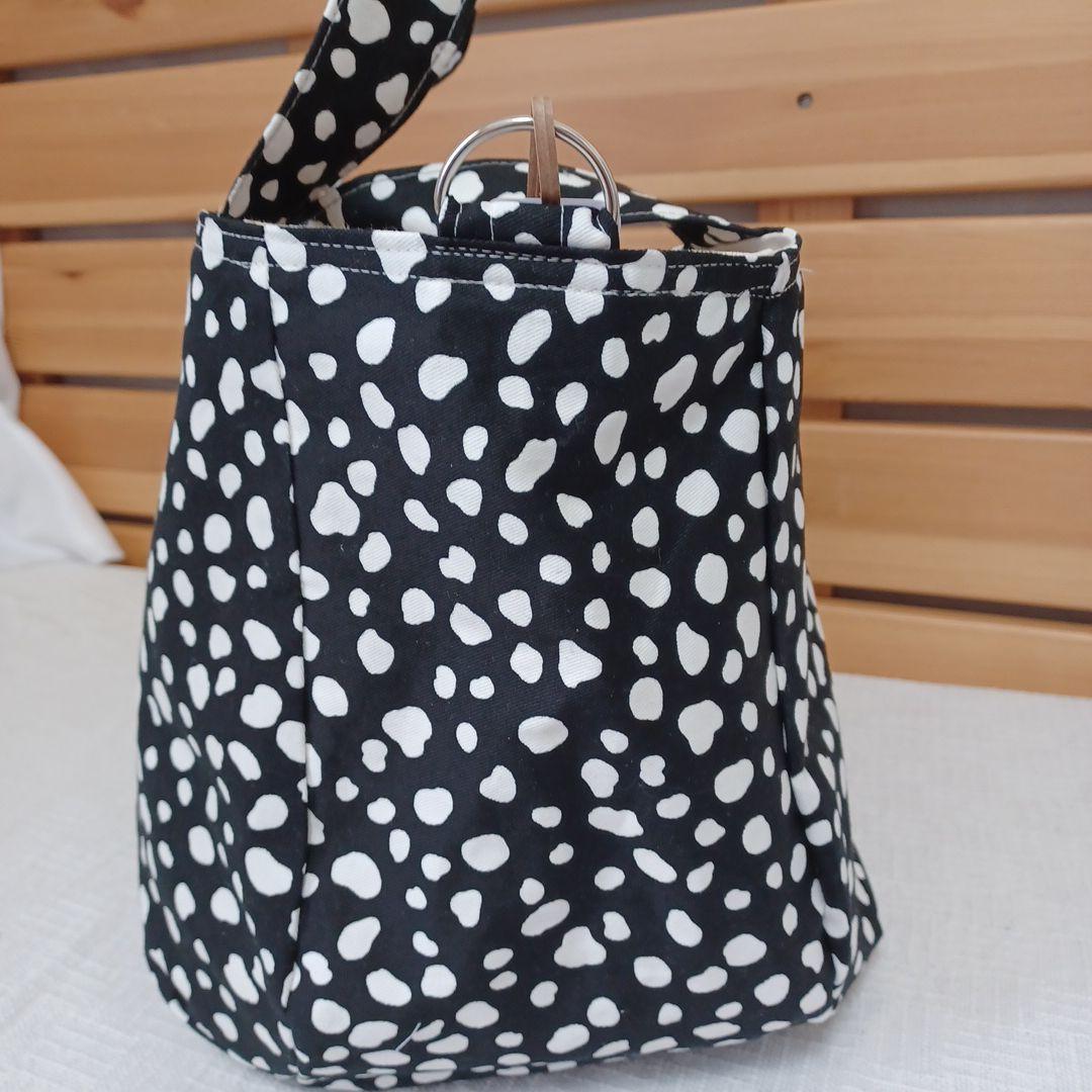 黒と白のドット柄のトートバッグ、スナップボタン付きで使いやすいデザイン。