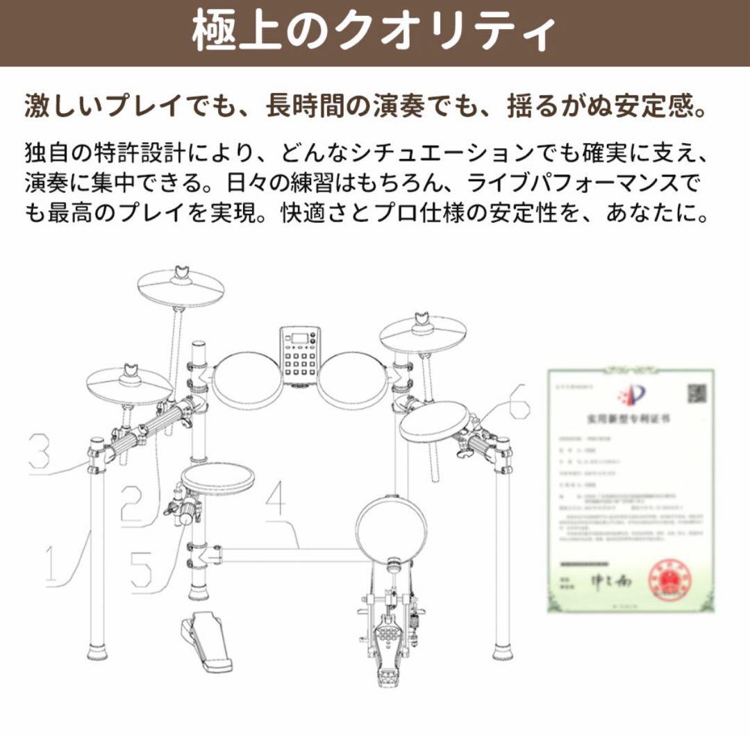 【Dream社の高品質音源&特許技術】 本製品はフランスのDream社の高品質音源を採用し、わずかな音色の違いまで忠実に再現。まるでライブのようなリアルな演奏感を実現します。 さらに、設置のしやすさと耐久性を向上させるため、2つの特許(外観デザイン特許&実用新案特許)を取得。アルミパイプスタンドの内部にギア構造を採用し、より安定したセッティングが可能に。 これにより、日々の練習がスムーズになり、ステージ演奏でも自信を持って演奏できます。快適でプロフェッショナルなドラム体験をお楽しみください。