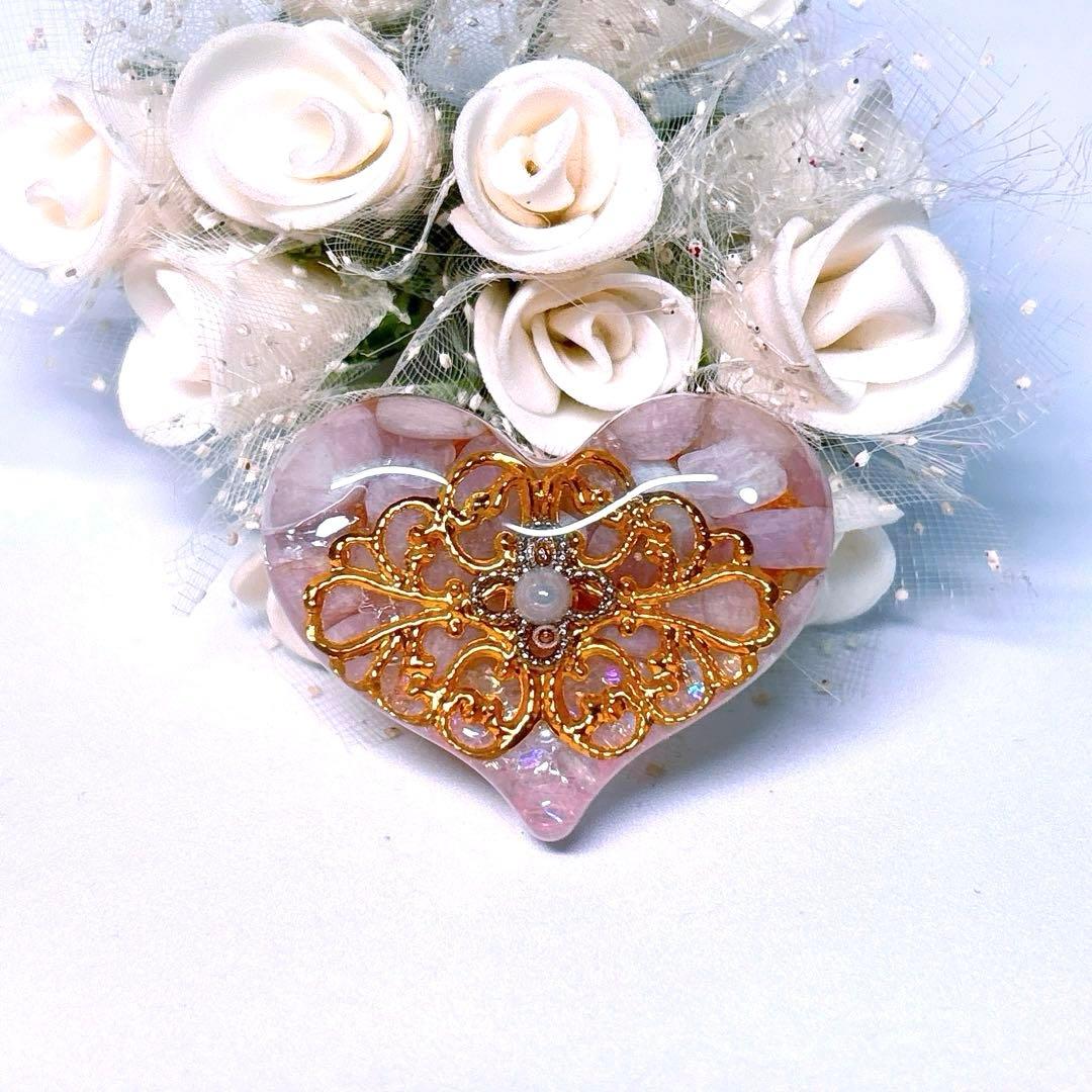 淡いピンクのハート型クンツァイト金色の装飾とパールが施されたハンドメイドネックレス。