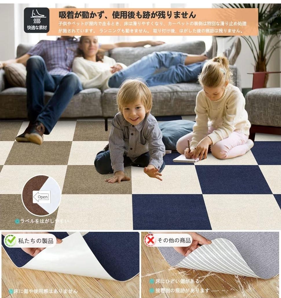 【ジョイントマット 吸着マット】 タイルカーペット底部の特殊構造が吸盤のようにくっつき、カーペットを叩いても動かず、どの床にもしっかりと吸着します。ペット連れのご家族、お子様、お年寄りに最適です。