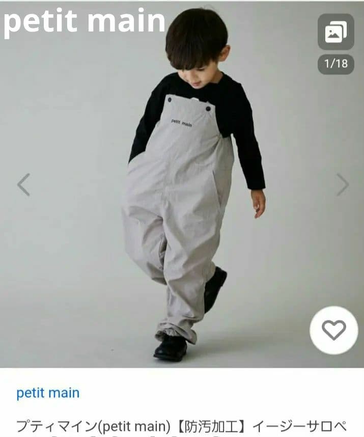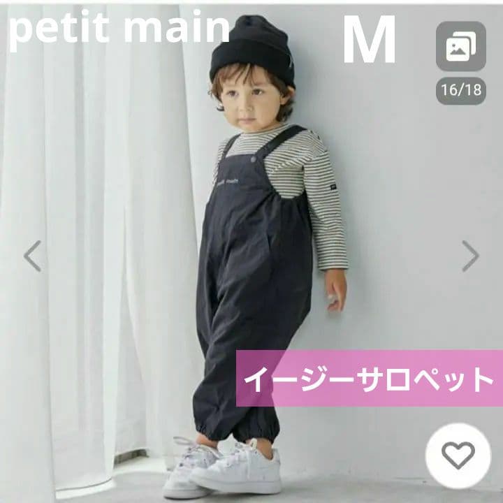 ベージュのpetit mainオーバーオール、Lサイズ、ゴム入り裾で快適な着用感。