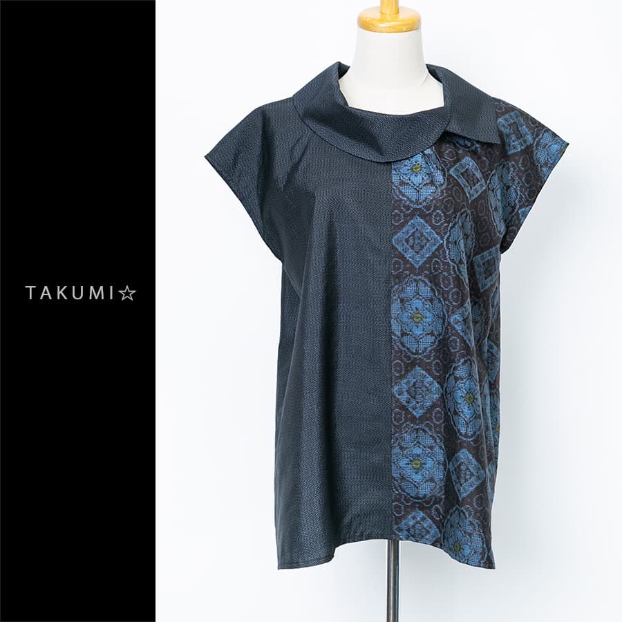 大変美しい紺系の大島紬を使用したロールカラーのフレンチ袖チュニックです。