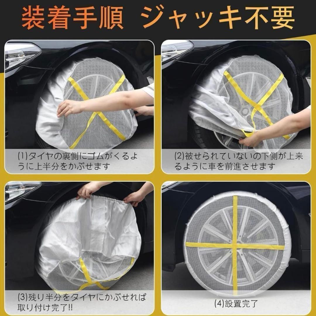 【仕様】 ✴️商品内容 布製タイヤチェーン:駆動輪2本分、長い手袋、日本語取付説明書 。 ✴️安定して静かな乗り心地 振動無し、騒音無し、100%タイヤ覆うタイヤを傷めない!雪道でタイヤチェーン同等の機能を発揮しますが、耐久性等の特性がタイヤチェーンとは異なります。 ✴️滑り止め効果強化 布製タイヤカバーは、特殊な高弾性ポリエステル布の繊維が毛羽立っている状態で、雪面にしっかりと密着してくれて、タイヤのグリップ力を強めてくれます。 ✴️取り付けわずか3分、どなたでも簡単に装着。タイヤと車体の空間が狭い車にも装着可能で、ジャッキアップも特別な工具も不要です。
