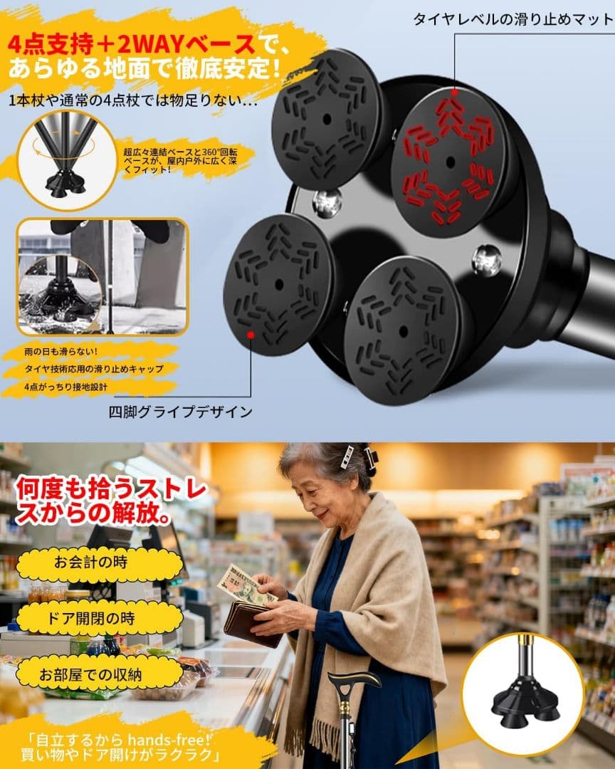 【革命的な2WAYベース】 屋内外対応の多機能ステッキ。室内は連結広幅ベースで4点支持の高安定・自立可能。屋外は360°回転ベースで砂利道や不整地もスムーズに歩行でき、高グリップキャップが雨天や雪道でも安全。1本で屋内外どちらにも使える万能仕様。