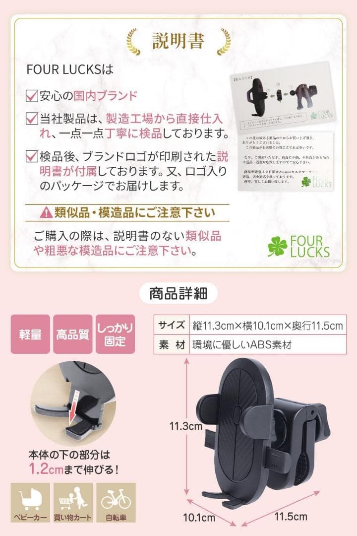 【グリップ幅最大・大口径】 最大幅6インチ以上の大画面にも対応しています。又、ベビーカー用に太めのハンドルになっています。ショッピングカート等に取り付け、お子様に動画を見せる事が出来ます。 ☆フック2個セット 取り付け簡単!360度回転ベビーカーダブルフック ママたちのお出かけの悩みがすっきり解消! 赤ちゃんとのお出かけは荷物が多くて・・・手がいくつあっても足りないもの。そんな悩みも「ベビーカーフック」で解消! サっと荷物をかけることが出来て、便利なベビーカーの必需品です。 手荷物すっきり!ママの荷物も赤ちゃんの荷物もすっきりひとまとめに! 両手があくので安全面でも安心◎ 360°回転するので、片手でもどの向きからも荷物がすぐにかけられます。 面ファスナー式なので、どんなタイプのベビーカーにも簡単に取り付けられます。 また、旅行のキャリーケースや、車のヘッドレストやグリップにも! お出かけに欠かせない便利アイテムです。 6-3-561 $$1521 ベビーカー スマホホルダー ベビーカー 携帯ホルダー スマホホルダー 自転車 取り付け簡単 ショッピングカート 買い物カート 車椅子