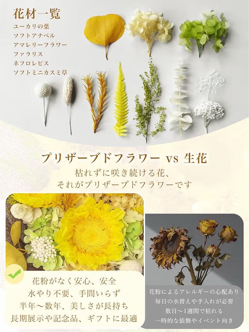【厳選された高品質ヒマワリ】 天然のひまわりを使用し、特殊な加工技術によって鮮やかな色合いと柔らかな質感をそのまま閉じ込めています。枯れることなく、長期間美しい姿をお楽しみいただけます。