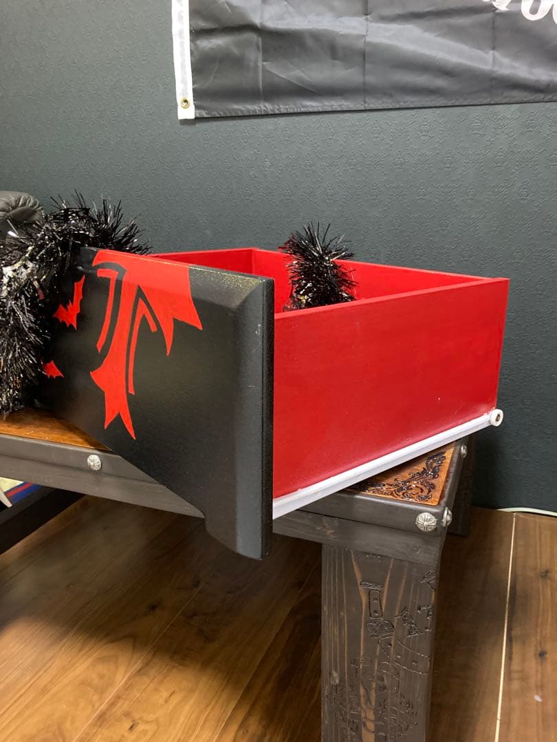 【注意事項】 水性塗料を使用しております。 最終仕上げ加工(クリア仕上げ)は施しておりますが、強い衝撃や水性のものに触れると、デザインが損なわれる可能性がありますのでご注意ください。 - デザイン: 側面は黒と赤のストライプ :最終仕上げにこだわり、今までにあまり見た事ない肌質の塗装になっています‼️ :引出しもレッド塗装‼️ - 色: ブラック&レッド - 形状:新品 - 装飾: ハンドメイドのデザイン