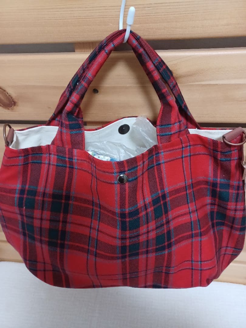 赤と黒のチェック柄のカジュアルなトートバッグ。