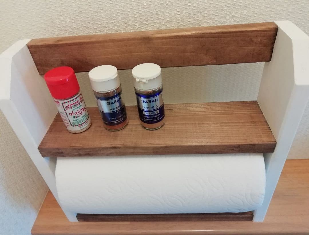 キッチンペーパーフォルダになっており、棚板にはスパイス、調味料ほか、お好きなカップを並べても楽しいです♪