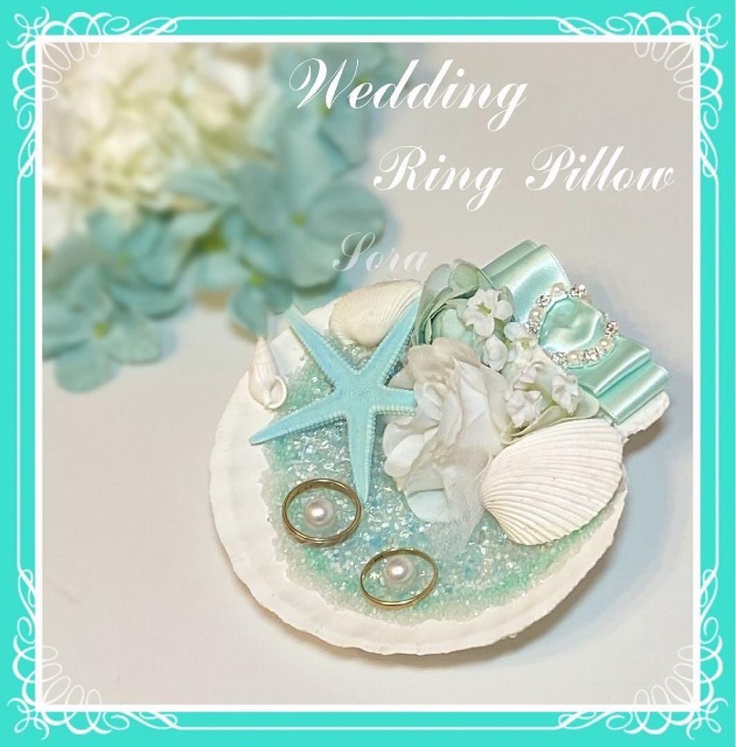 帆立貝にヒトデ 、シェル 、グラスサンドの砂浜で 海をイメージした ウェディング リングピロー です。