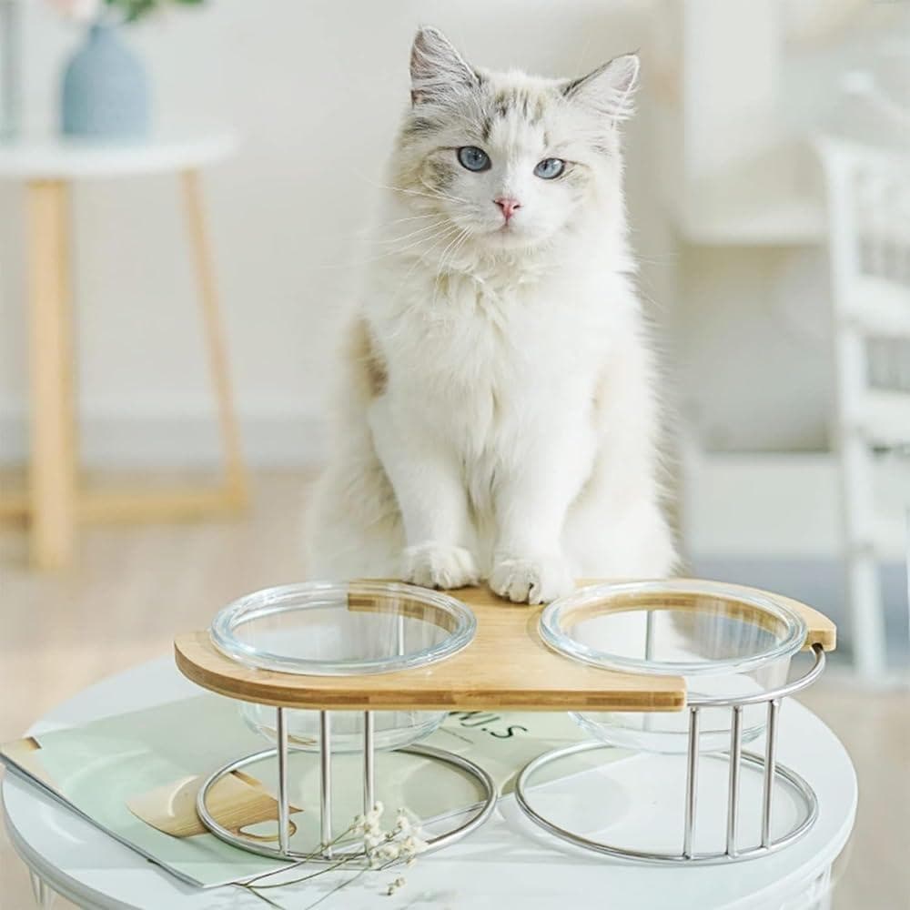 この猫用食器は、高品質のオーク材とガラス素材で作られており、高級感と質感があります。