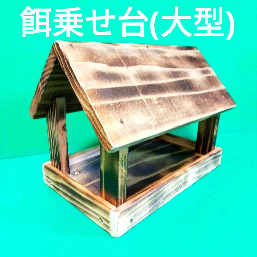 【小鳥の餌乗せ台(大型)】高さ約20.5cm・横幅約28cm・奥行約18.5cmの4面どこからでも入れて、餌がこぼれにくいように縁を付けて、底面に水ヌキ穴をあけ、焼き目を付けて仕上げてあります。 水飲み容器を置けるように横長にしました。 吊り下げての設置もできるようにヒートンフックを2個準備しますので、お好みの場所に付けてご利用ください。 お庭に餌乗せ台を置いてバードウォッチングして見ませんか? 巣箱も近くに置くと巣造りしてくれるかもしれません。 巣箱もご購入希望の場合は、ご購入前にコメントにてお知らせください。 素人の手作りですので、ご理解の上ご購入ください。
