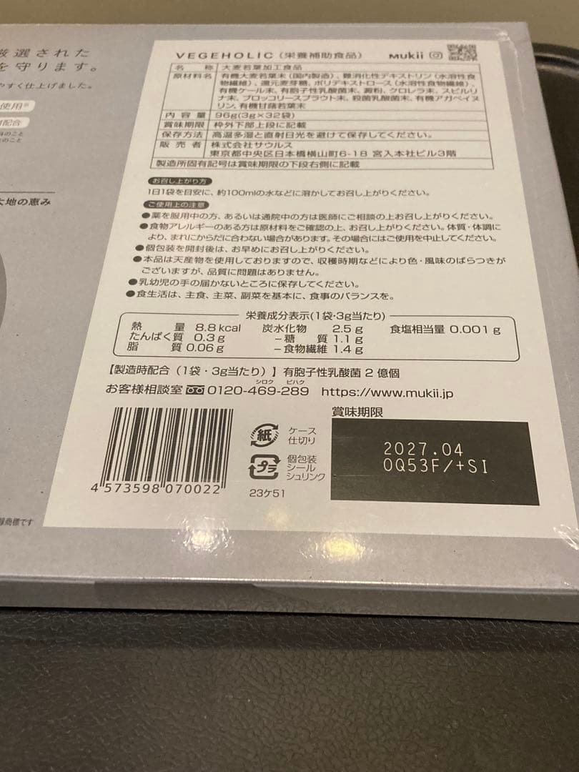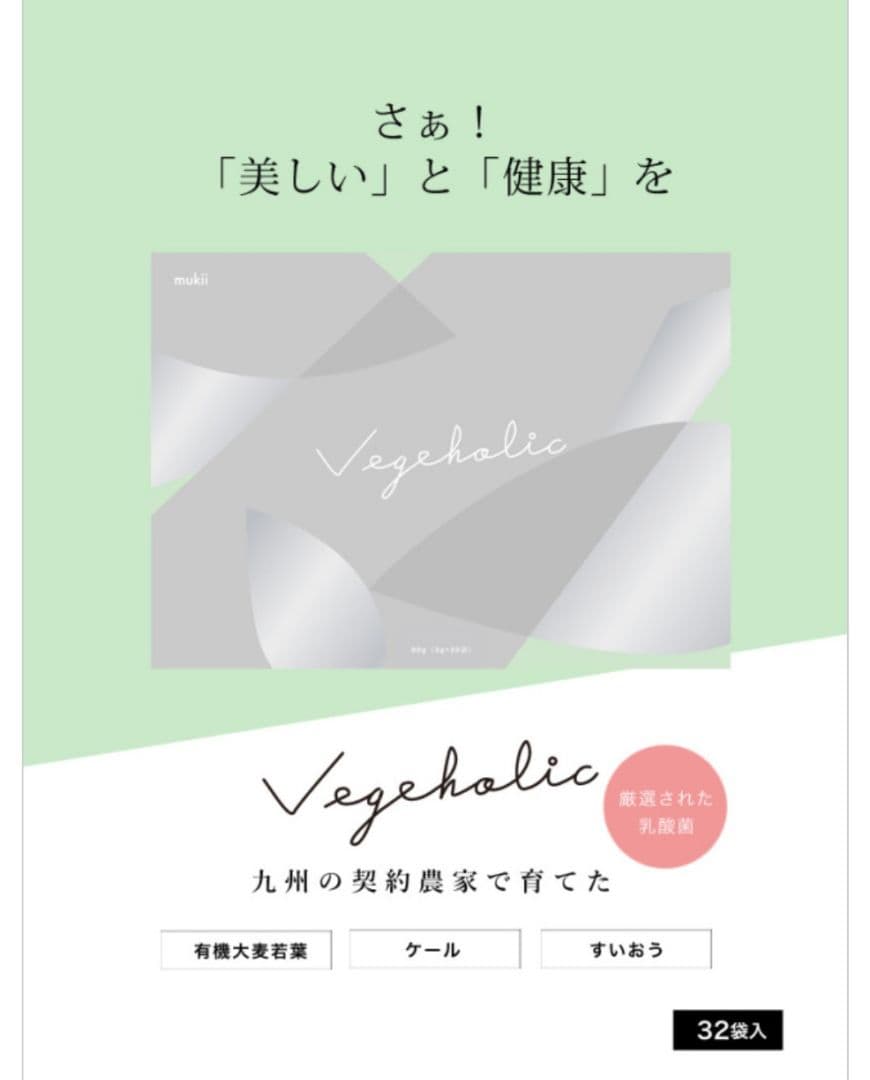 【使用方法】 1日あたりの摂取量は個人の健康状態や目的に応じて調整可能です。スープとして飲むことができ、忙しい日常でも簡単に取り入れられます。 - 商品名: VEGEHOLIC(栄養補助食品) - 内容量: 96g(3g×32袋) - パッケージデザイン: シンプルでモダンなデザイン - ブランド名: mukii