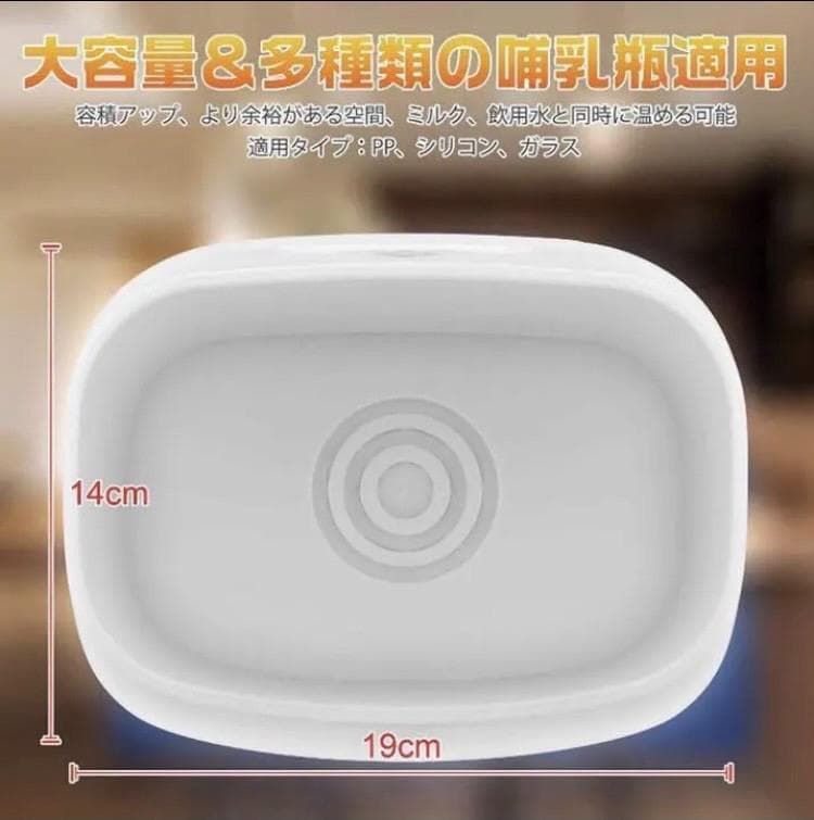 【1台4役★多機能】 ミルク保温、温乳、離乳食加熱、哺乳瓶滅菌の4つの機能を搭載! 温乳ボタンが設置されていて、ミルクの加熱が簡単です。 14*19*24cmの超大容量で、ほとんどの哺乳瓶に対応可能♪