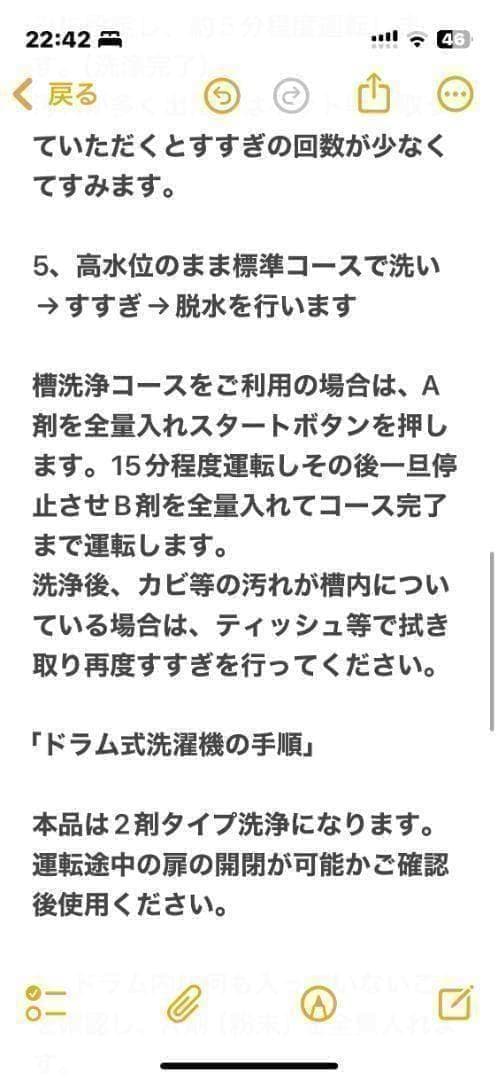 ドラム式洗濯機の場合、2剤タイプの洗浄となりますので運転途中に扉の開閉が可能かご確認ください。