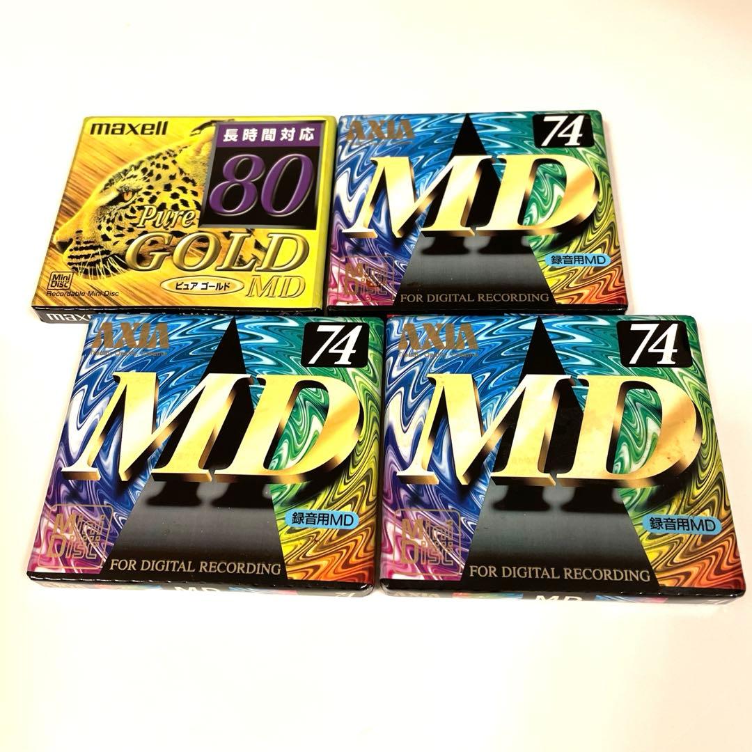 AXIA MD 74分3枚、maxell pureGOLD MD80分1枚の未開封未使用品のMDとなります。