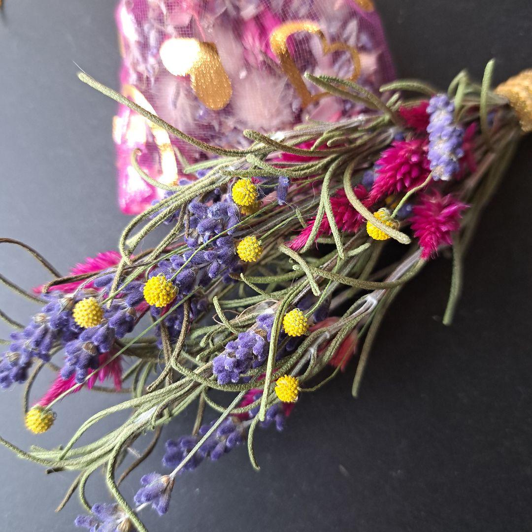 - 内容: ドライフラワーの束と香り袋