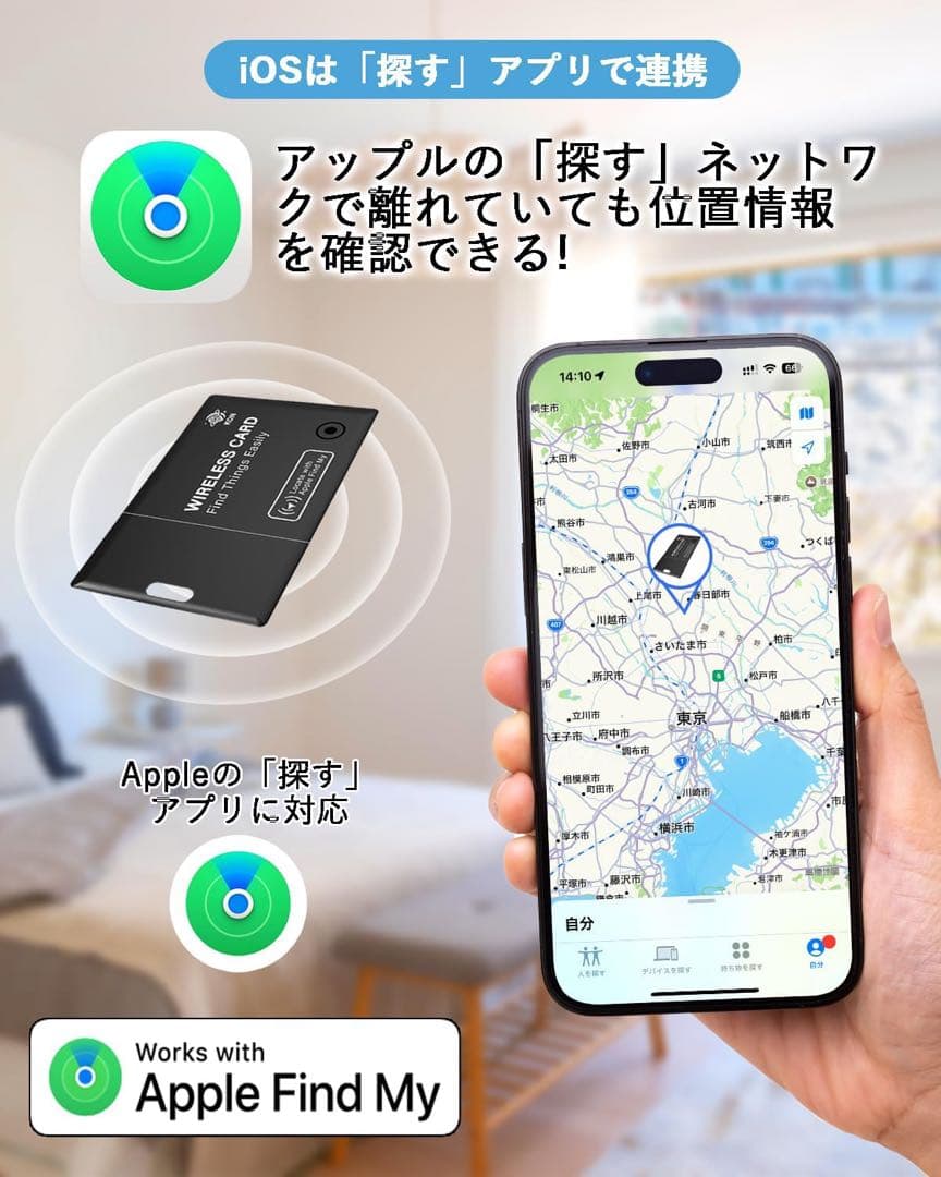 アプリをダウンロードする必要がありません。Appleの アプリ「探す」とBluetoothを開き、「持ち物を探す」と「その他の持ち物を追加」をクリックすると、30秒以内にペアリングが完了します。注:iOS端末のみ対応で、Androidは非対応です。Apple社が定めている性能基準を満たし、iOSデバイスとの互換性が確保されます。Appleの「探す」ネックワードにサポートされているため安定した接続が可能。