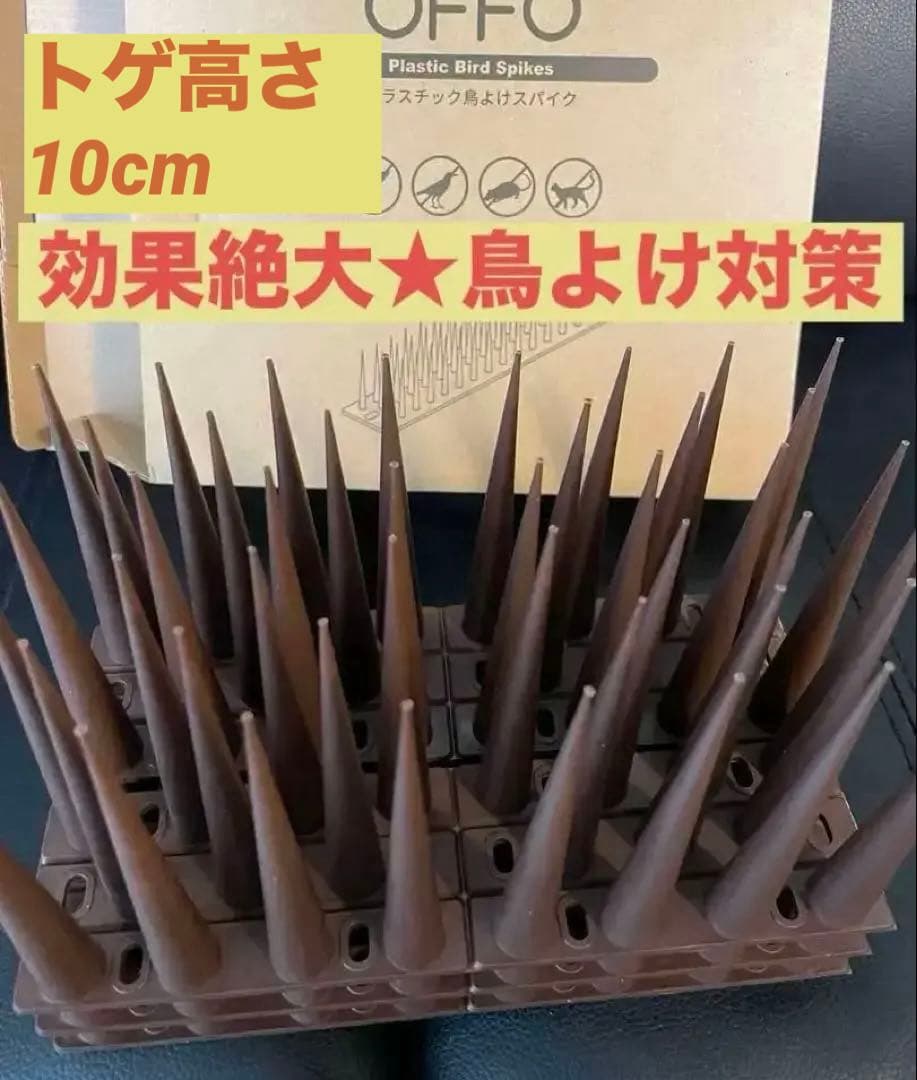 【最終価格】 プラスチック製の鳥の侵入防止用スパイク、ブラウン。大量購入した為、今回出品します。 マンションで鳩のフン被害が増えた為、管理人さんの勧めで即購入。 即効性が高く、鳩やその他の鳥もピタッと来なくなりました。実証済み!!効果絶大です!! トゲが鋭く長いので、鳩やカラスなどの被害にお困りの方にお勧めです。マンションやアパート等のベランダから、侵入する動物除けにも効果がありそうです。(例えば猫など) ⚫︎ブランド: OFFO ⚫︎商品名: Plastic Bird Spikes ⚫︎カラー: ブラウン ⚫︎素材: プラスチック ⚫︎用途: 鳥の侵入防止(鳩やカラス など) (害鳥の着陸を防止) 両面テープなどで接着する タイプ (両面テープは含んでいません) ⚫︎サイズ: トゲ高さ約10cm、 幅横約10cm 全長123cm(隙間なく設置 した 場合)、ハサミで切り離せる 為、隙間を設ければ、もう 少し長い 範囲で幅広く設置可能 ⚫︎数量: ・横幅20cm幅、3個1ピースで 使用時は6個 ・ 〃 〃 且つ1ピース 1行で使用時は18個 ・横幅10cm幅、3個1ピースで 使用時は12個 ・ 〃 〃 且つ1個 1ピースで使用時は36個 #鳩やカラス除け #鳥フン被害対策 #動物除け #OFFO #ベランダ #鳥の侵入防止 #猫避け #効果絶大 #即日購入歓迎