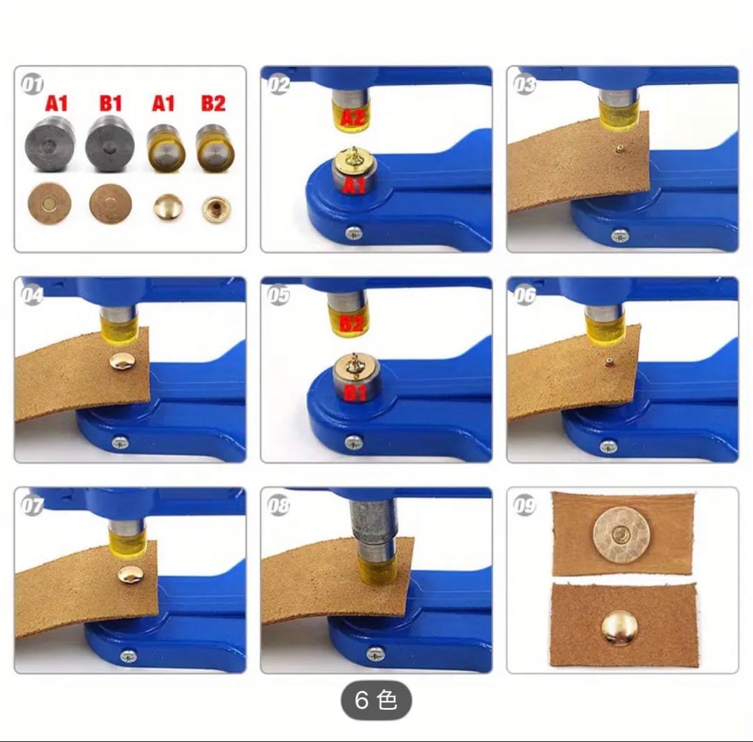 カシメ、ハトメ、アイレット、菱目打ち等、いろんなコマを購入すればなんでも叩かずにできるので便利です。