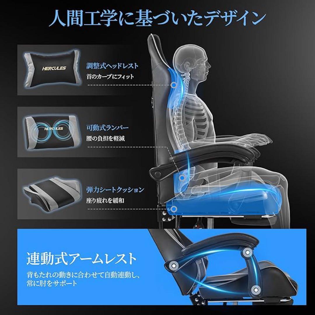 エルゴノミックデザインのHERCULESゲーミングチェア、リクライニング機能付き、最大体重136kgまで対応。