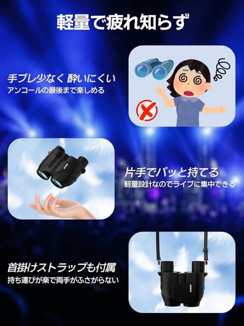 【どの席でも満足に推しを見れる】コンサートで少しでも近くから推しを眺めたい。そんな願いを叶える双眼鏡!アリーナやドームなどの大きい会場で手ブレを気にせず見れます。100メートル先の推しを10メートルの距離から見ている感覚です。