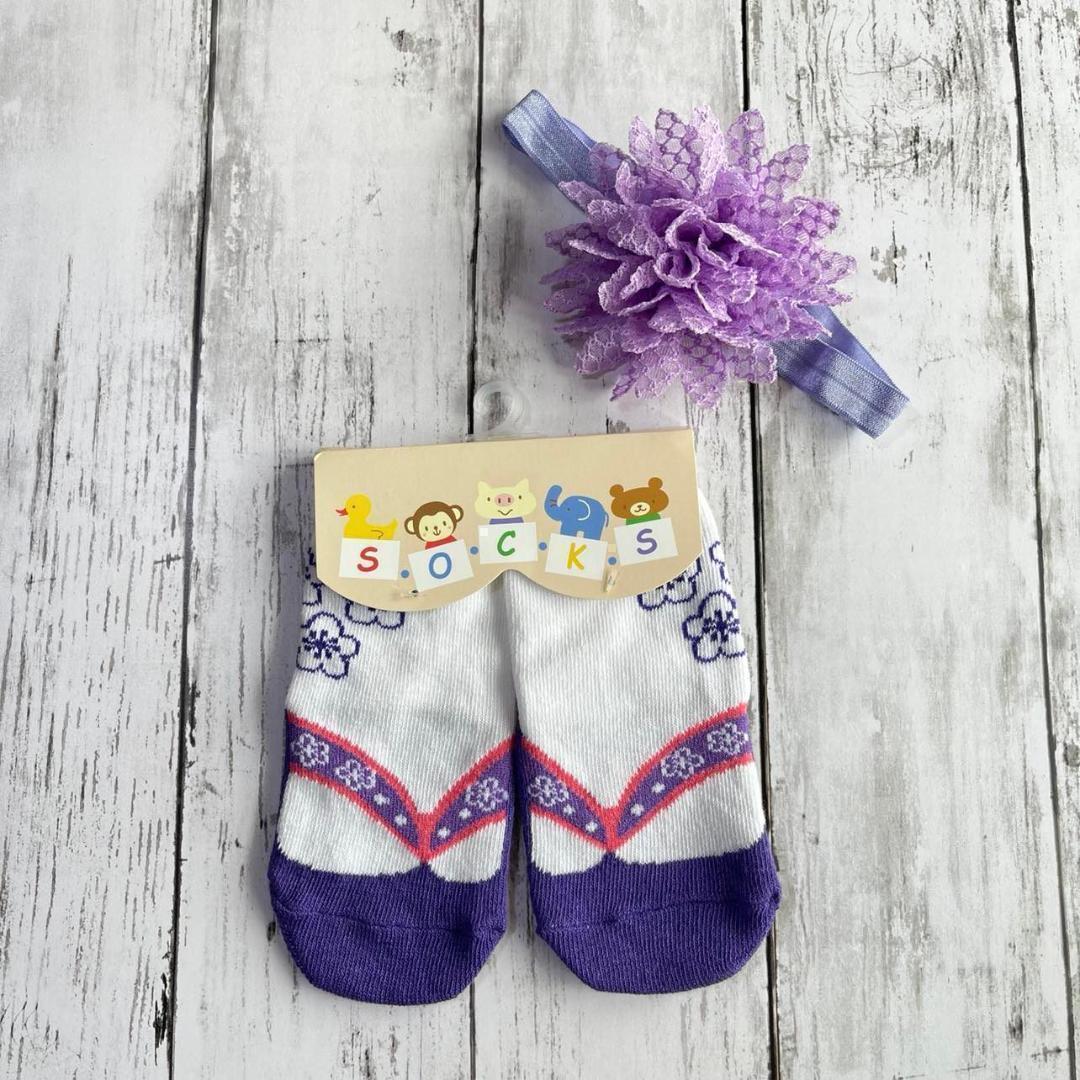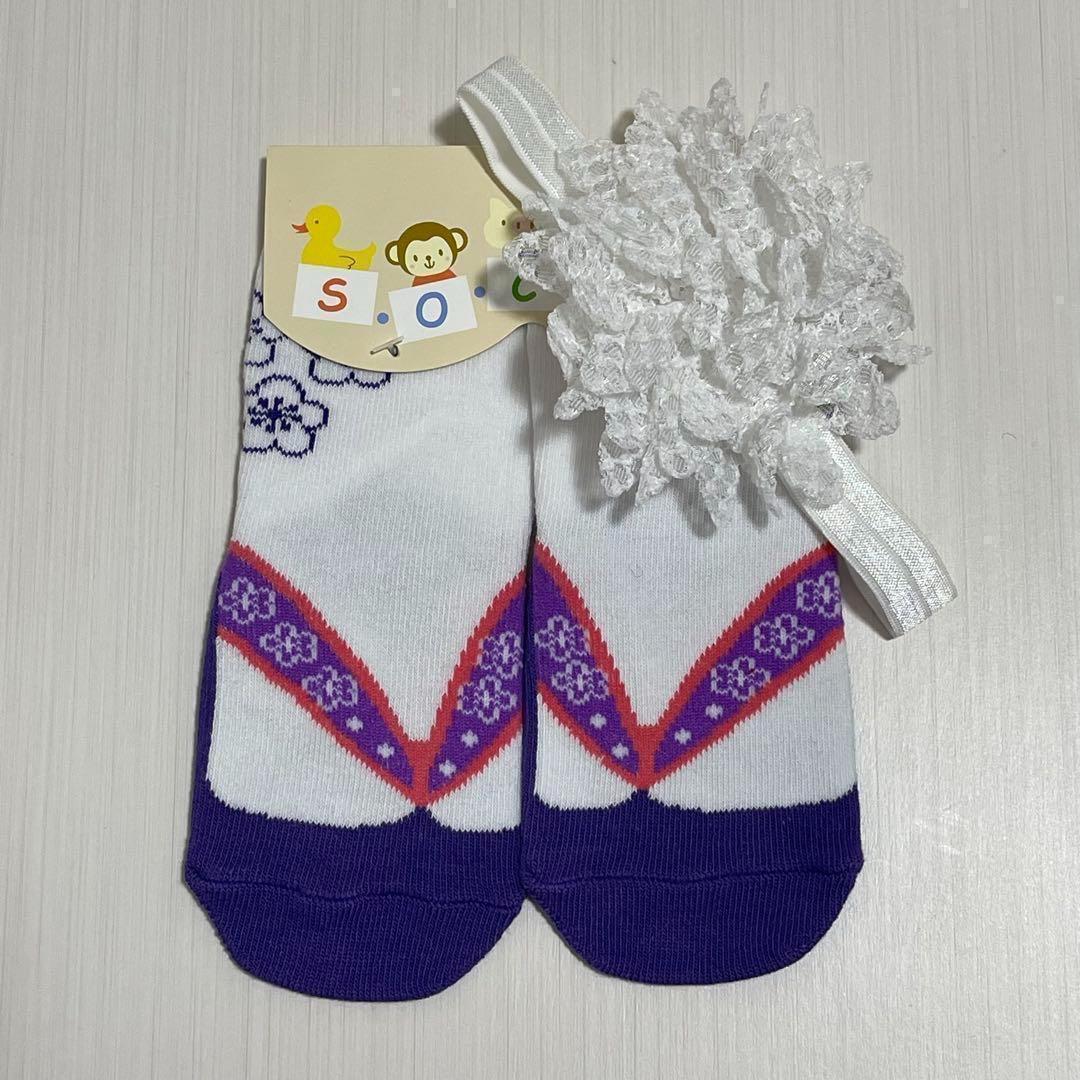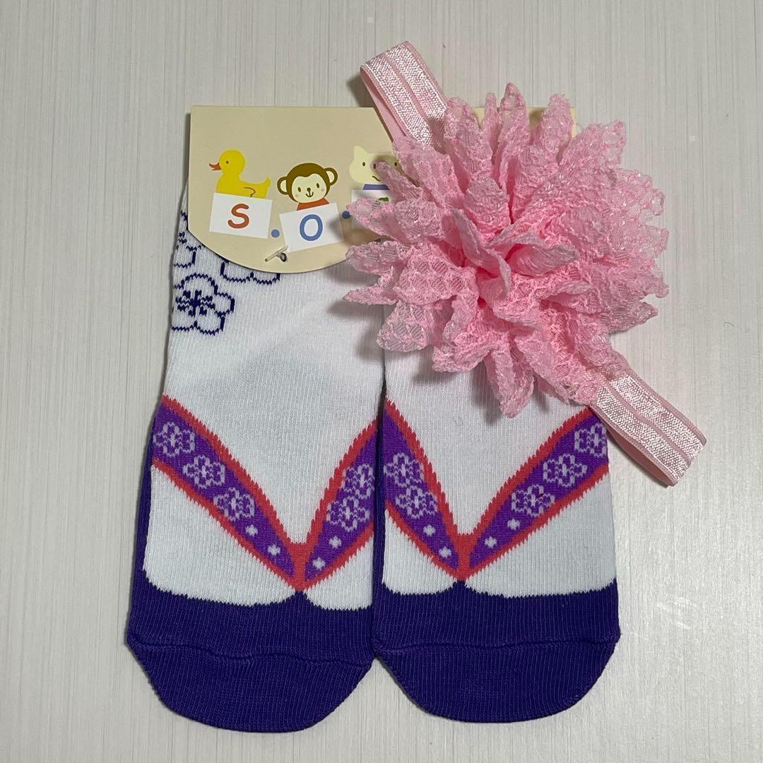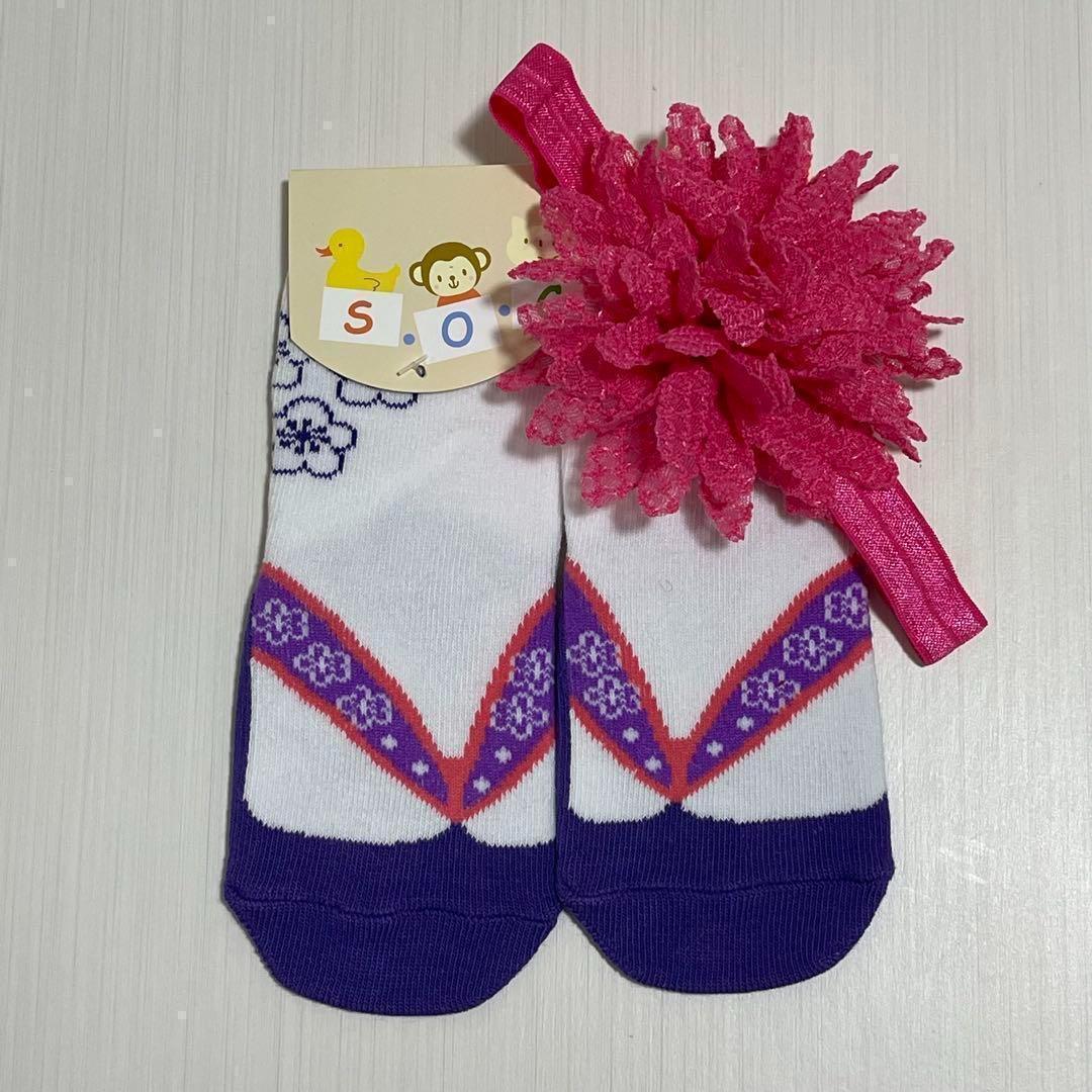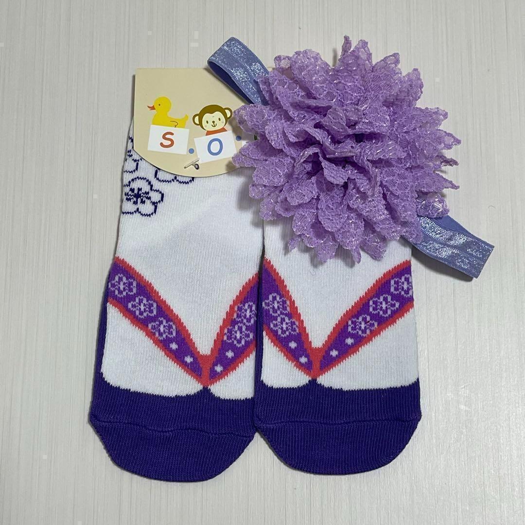 【セット内容】 草履柄靴下 紫 9-12cm ヘアーバンド ⑤紫色(色変更可能) 赤ちゃんや幼児用の袴ロンパースやベビー着物に合う 髪飾り・ヘアバンドと靴下のセットです。 発送は