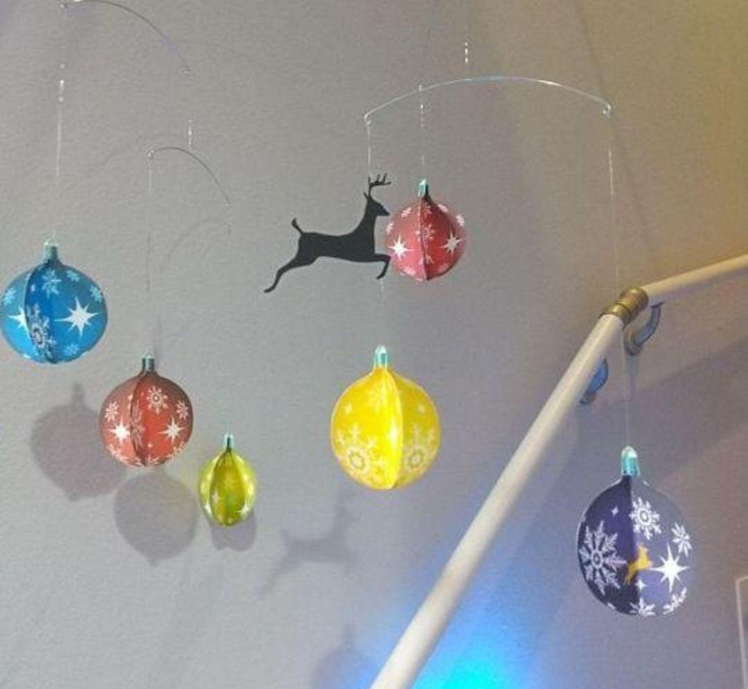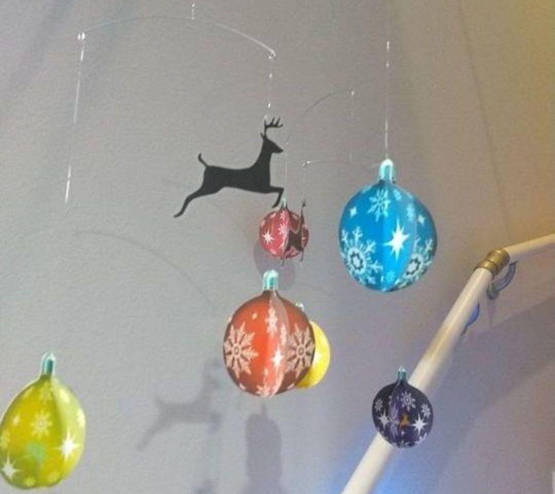 X'masモビールとは動く彫刻。オーナメントを糸や針金でつるし、それらがバランスを保ちながら、わずかな風で微妙に動くようにしたものです(*^^*)
