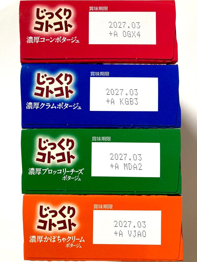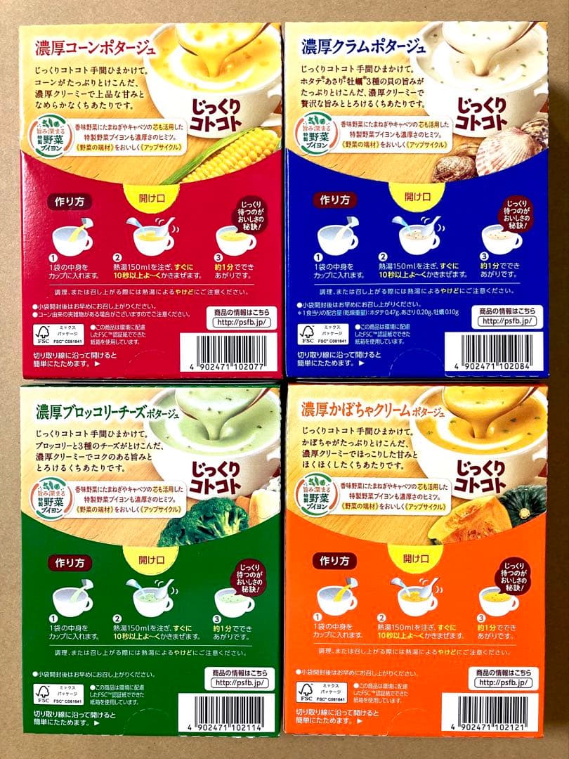 素材のおいしさまるごと『じっくりコトコトカップスープ』一番人気の4種類、3食入りが4箱です。
