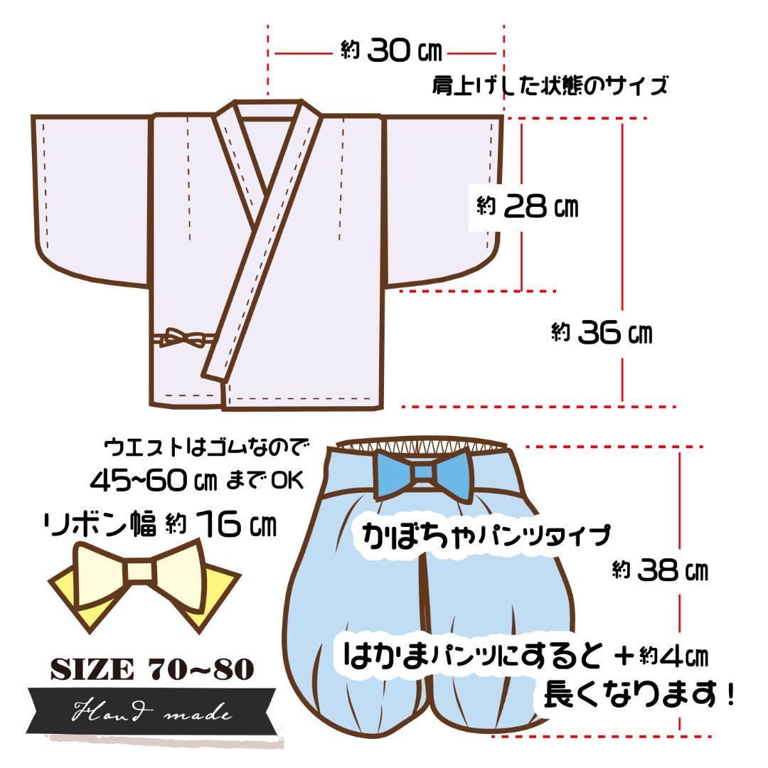 【即発送可能】です ★価格★ ばるべく低価格にての出品を心がけておりますので、複数のご購入など以外ではお値引きしかねます。 ★基本的にかぼちゃパンツでご用意しておりますが袴タイプに変更をご希望の場合はメッセージを入れてください (^^)/(袴タイプに変更時でもリボンは二重リボンとなります) ★上着物★ 紐で結んで着る甚平タイプで、肩上げがしてありますのでほどけば成長されても長く着て頂けます。(裄丈が5~6㎝ほど長くなります) ★下かぼちゃパンツ★ ウエストは後ろ身頃のみゴム仕上げで着やすく、おなかを締め付けない作りにしてあります。 裾のゴムを取ればはかまタイプに変身できるので幅広い年齢のお子様に着ていただけます。 ★ウエストリボン★ プラスナップで付けてあります。取り外し可能で小さなお子様にも安全に着用していただけます。 ★素材★ 上着物 (綿100% コットンプリント) 下はかま(綿100% ツイル) ★ご注意★ ・職業用ミシン・ロックミシンで縫製しています。 ・ハンドメイドのため多少の歪みやズレがあることもあります。ご理解のある方のみご検討いただけたらと思います。 ・掲載画像につきましては、実際の商品と色味が同じになるように撮影していますが多少の違いが生じることがあります。 ・折りたたんで発送します。畳みジワが気になるようでしたら着用前に低温でアイロンをかけてご使用ください。 ・洗濯は手洗いかネットに入れてソフトに扱ってください。 質問をお受け中でも、即決購入の方を優先させていただきます。 #ハンドメイド #手作り #ベビー袴 #ベビーはかま #男の子 #女の子 #キッズ袴 #はかま #ベビー着物 #子供の日 #お食い初め #バースデー #ハーフバースデー #ひな祭り #端午の節句 #節句 #お宮参り #出産祝い #七五三 #お正月 #誕生日