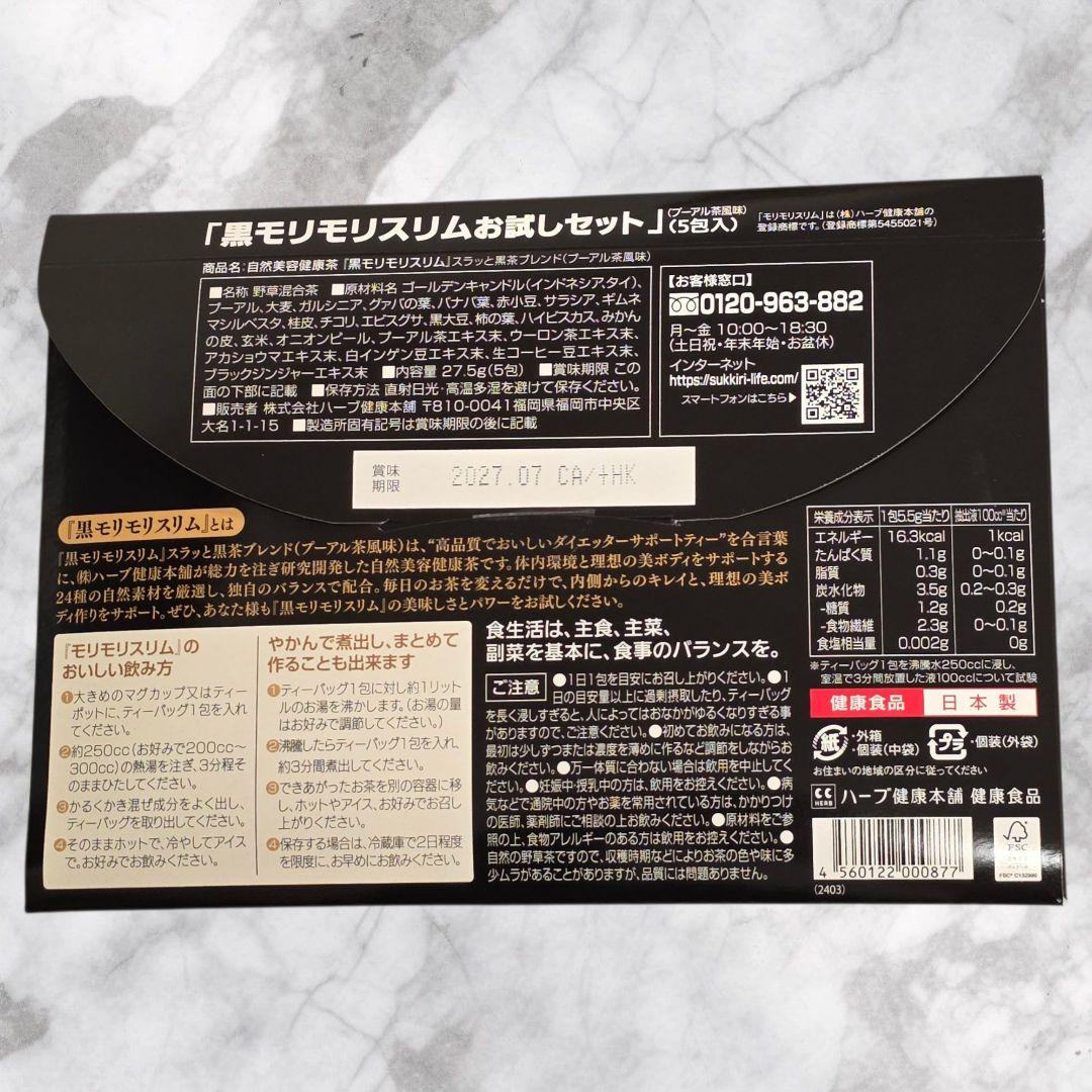 ■黒もりもりスリム 自然のチカラでスッキリをサポートするダイエットサプリ。 - 商品名: 黒モリスリム - 内容量: 5袋 (5.5g x 5) - 成分: プール青汁、酵素、食物繊維 - お試しセット: お試しセット - 賞味期限: 2027年07月