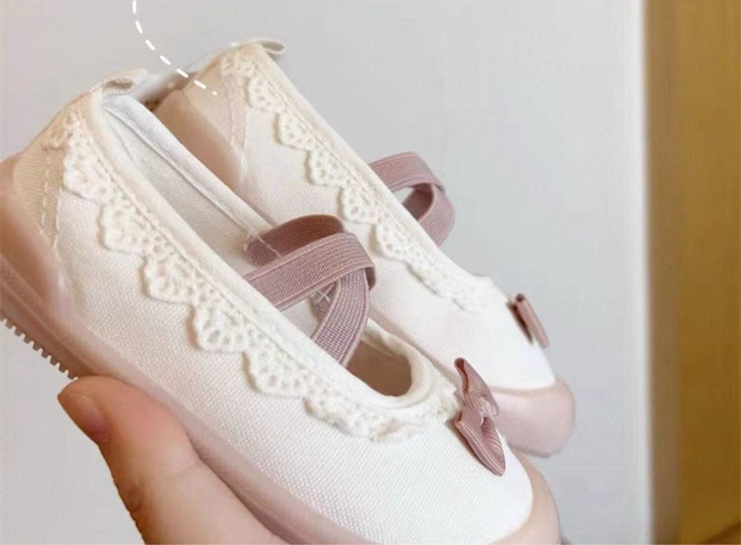 キッズ可愛いリボン付きバレエシューズ ホワイト/ピンク19cm