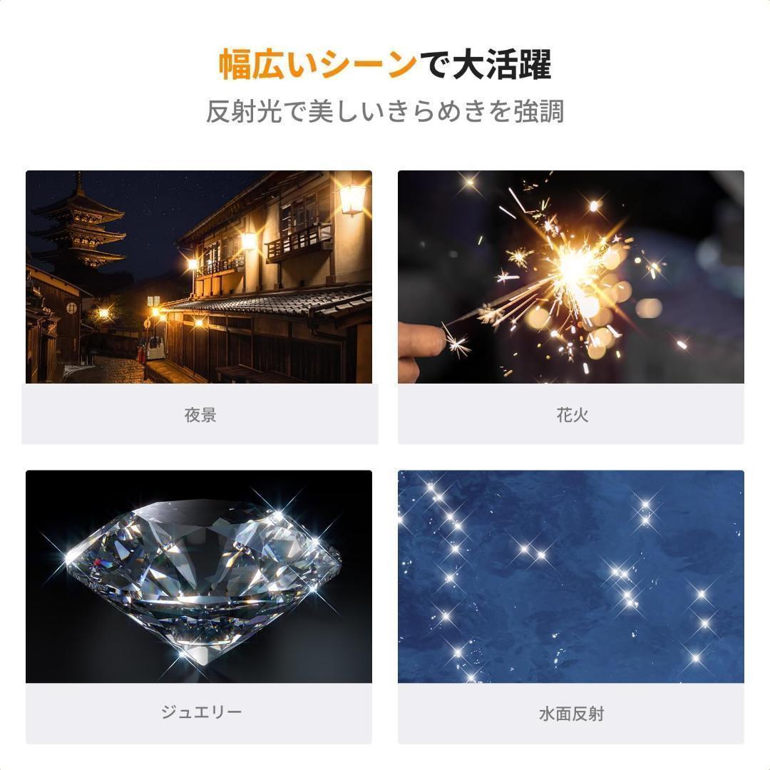 【光学ガラス・クロス効果】 高解像度のAGCガラスを採用しており、光の分散と歪みを効果的に軽減し、キラキラな光の効果を保証できます。夜景撮影や水面の輝き、イルミネーションなどシーンに最適です。