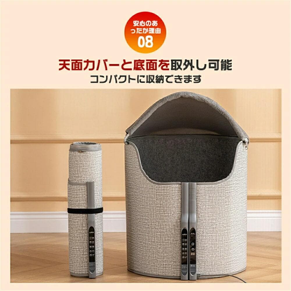 【製品の特徴】 わずか10秒で実感!「炭素結晶発熱」+「遠赤外線」で芯から温まる 最先端の炭素結晶発熱膜を採用し、通電から約10秒で均一に発熱。 遠赤外線が体の芯までじんわり届き、エアコンでは補えない“底冷え”を解消します。 独自の円筒形デザインで、720°全方位から包み込む温もり 従来の平面ヒーターとは違い、立体的な円筒構造を採用。 前後左右どの角度からも温熱が届き、足元全体を包み込みます。 足マット付きタイプなら足裏からも温められ、冷えやすい下半身を効率的にポカポカに。 “自分専用コタツ”にも変身! 付属のワイヤー入り天面パネルを装着すれば、保温空間が完成。 専用のふんわり毛布を使えば、熱が逃げにくく、まるでコタツのような快適空間に。 デスク下でもリビングでも、至福のリラックス