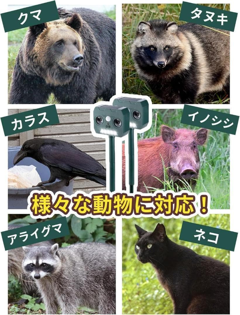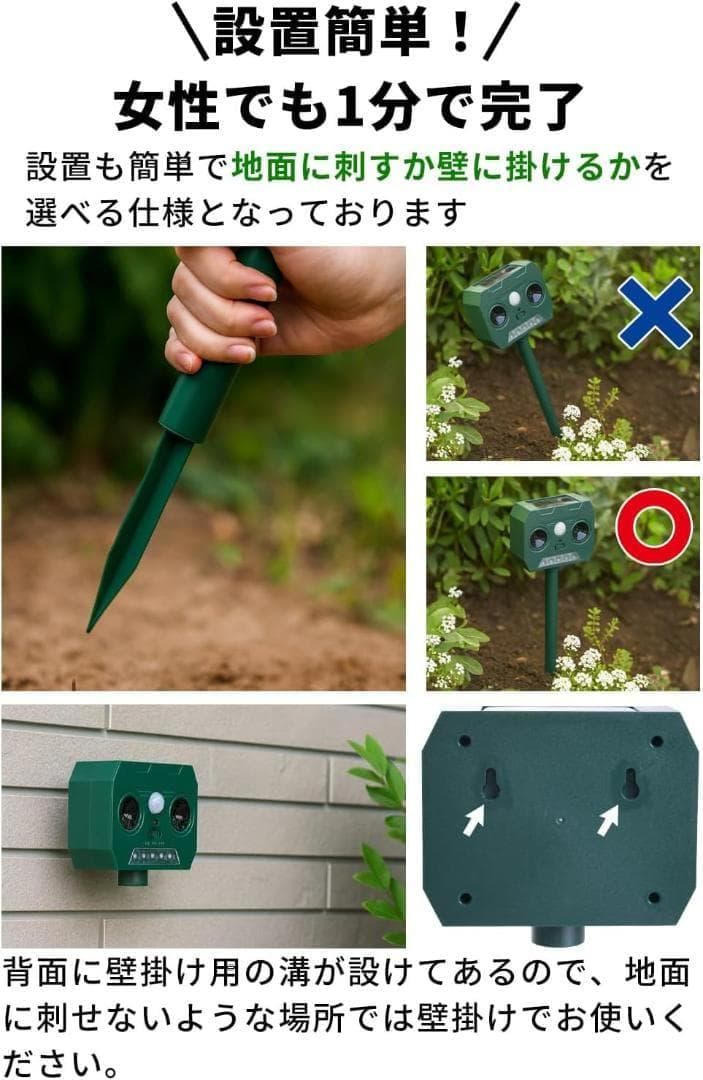 【超音波+LEDフラッシュのW撃退】 動物の動きを感知すると、高周波の超音波とLEDの強い光でダブル威嚇。人やペットには害のない周波数帯を使用しております。 ※人体に害はありませんが、距離が近いと音が不快に感じる場合がございます。