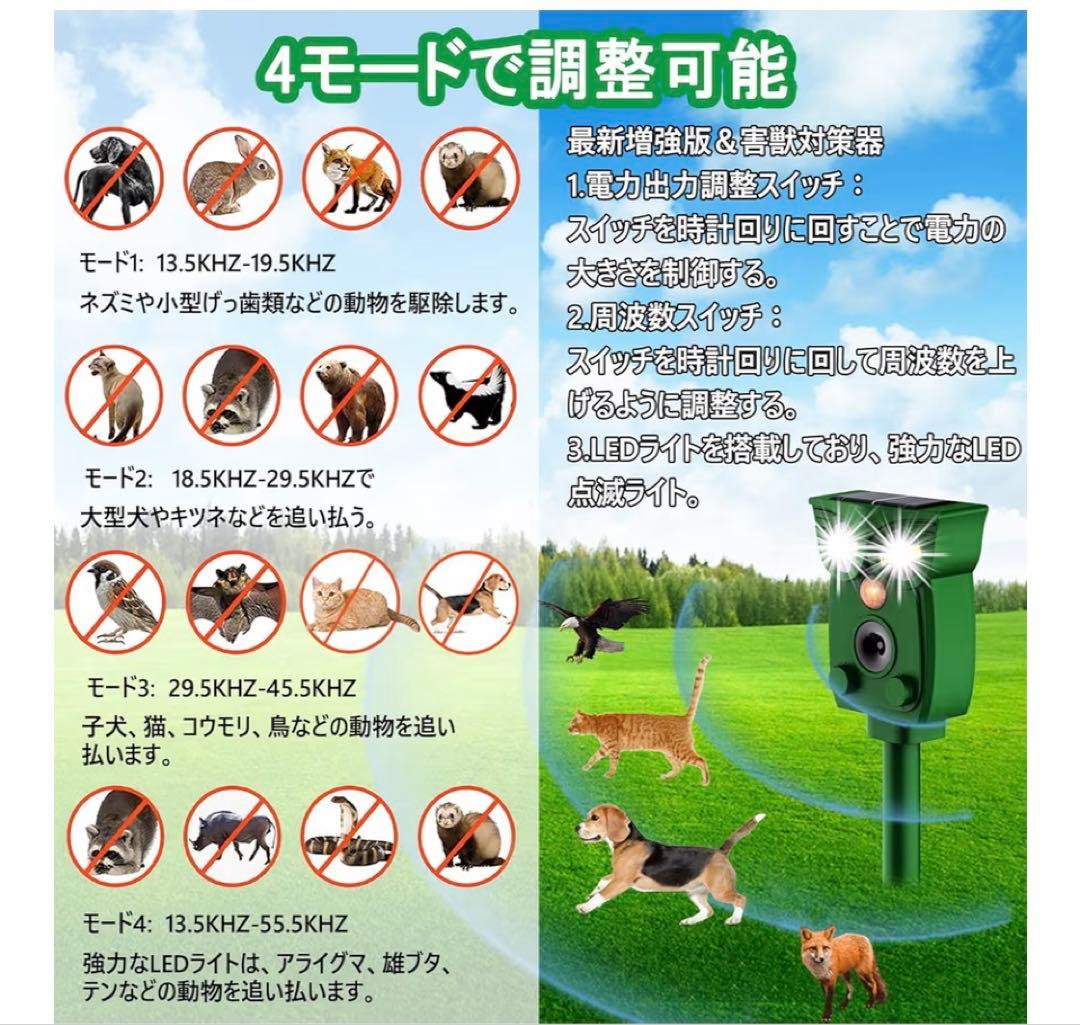 【業界新開発・害獣対策器】超音波 鳥避け 警報音 動物撃退機 ネズミ除け 猫退治 犬よけ LED強力フラッシュライト 害獣撃退 ソーラー充電/USB充電 3000mAh大容量/超長待機 IP65防水 5つ撃退モード 赤外線センサー 120° 12m感知範囲 畑/庭保護 日本語取扱説明書付 ご覧いただきありがとうございます。