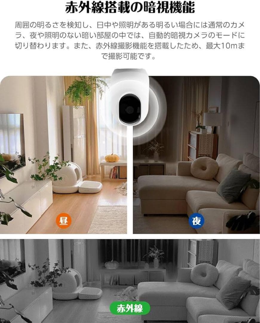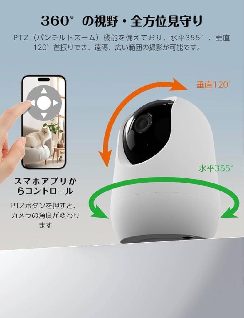 【360度全方位視野見守りカメラ・自動追跡機能搭載の室内用防犯カメラ】 室内用監視カメラはPTZ機能対応、水平(パン)355°垂直(チルト)120°と広い範囲の首振り監視することがアプリに簡単に調整できます。4-8倍デジタルズームを搭載し、隅々まではっきり監視できます。自動追跡機能搭載されており、人やペットの動きによって自動で追跡して撮影・録画可能です。自動追跡で不審者を最後まで撮影証拠を徹底的に残します