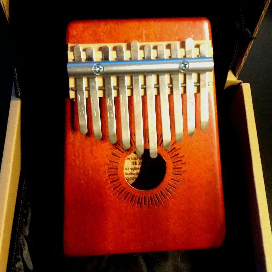 マホガニーカラーのカリンバ、チューニングハンマー付き。
