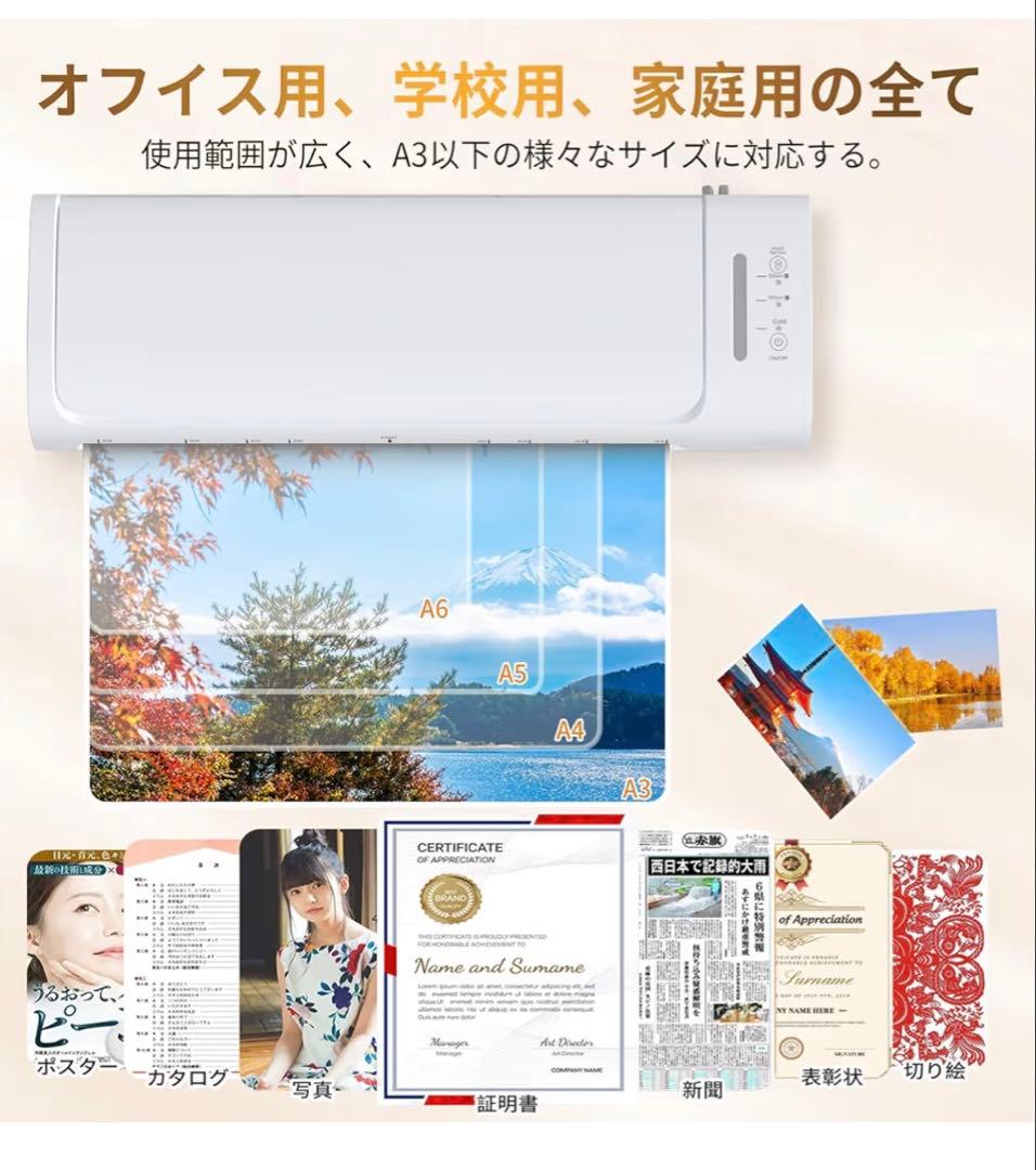【ラミネーター a3対応】ラミネート機械はa3 まで対応し、厚さ0.6mmまでの作品も処理可能で、幅広い互換性を備えています。