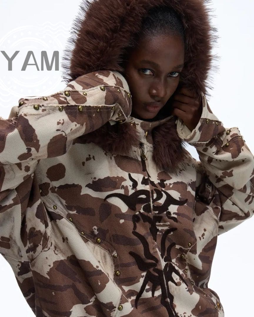 ○商品名: PERSONSOUL ANIMAL PRINT HOODIE WITH FUR-LINED HOOD 動物柄カモフラージュ ファー付きスウェットパーカー 中綿ジャケット 短丈