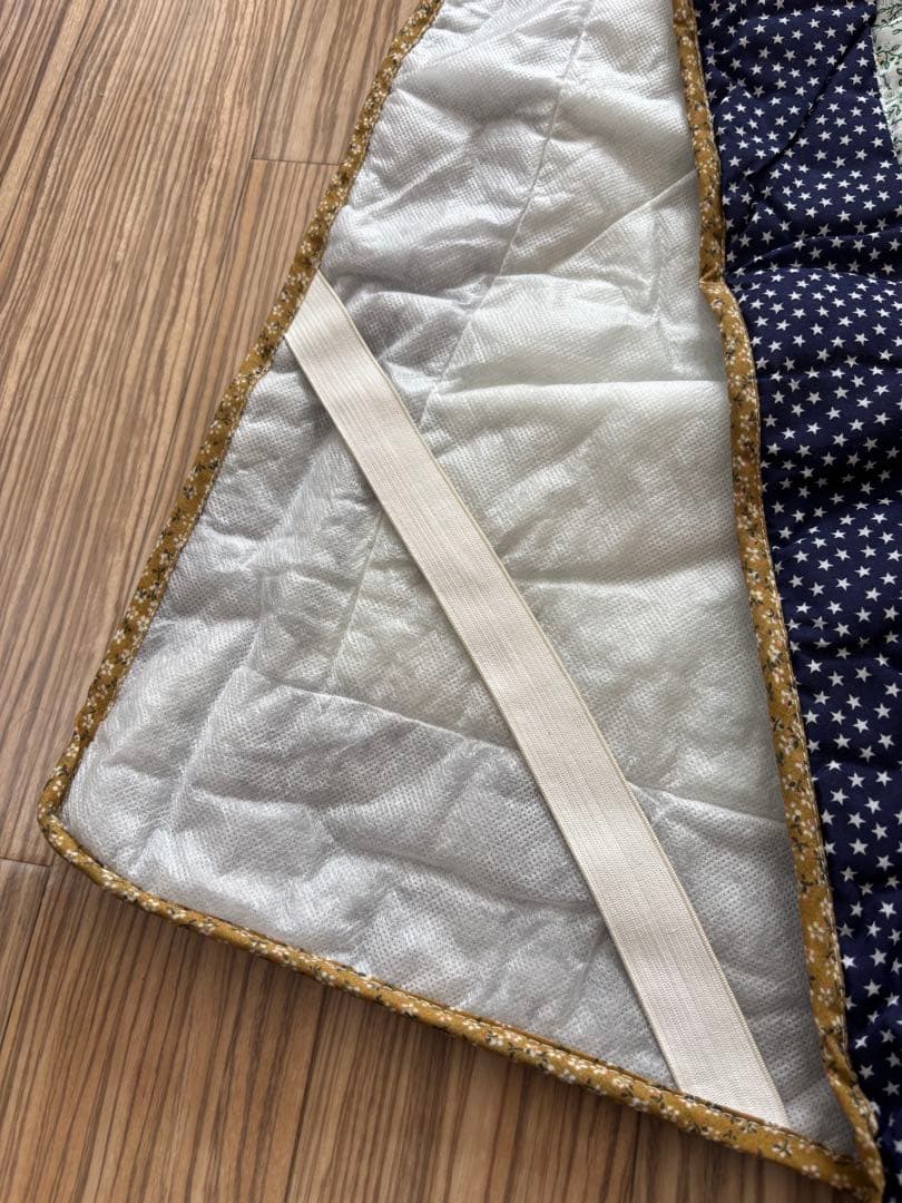 キルトのパッチワーク柄の敷物です。実家の片付けで出てきたもので、保管期間などは不明ですが、新品未使用のままクローゼットにて保管してあったものです。比較的風通しの良いところで保管しており、状態としては良いと思います。使用予定がないため出品致します。