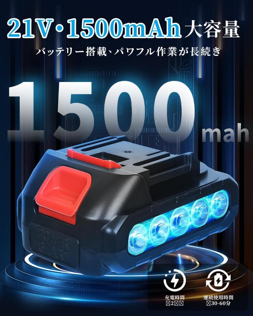 【長時間駆動×デュアルバッテリー】 約60分の連続使用が可能なバッテリーが2個付属しており、作業が途中で中断される心配を軽減します。 充電時間は約2時間と短く、休日のDIYにも最適です。コードレスで持ち運びやすく、室内外問わず使用可能です。