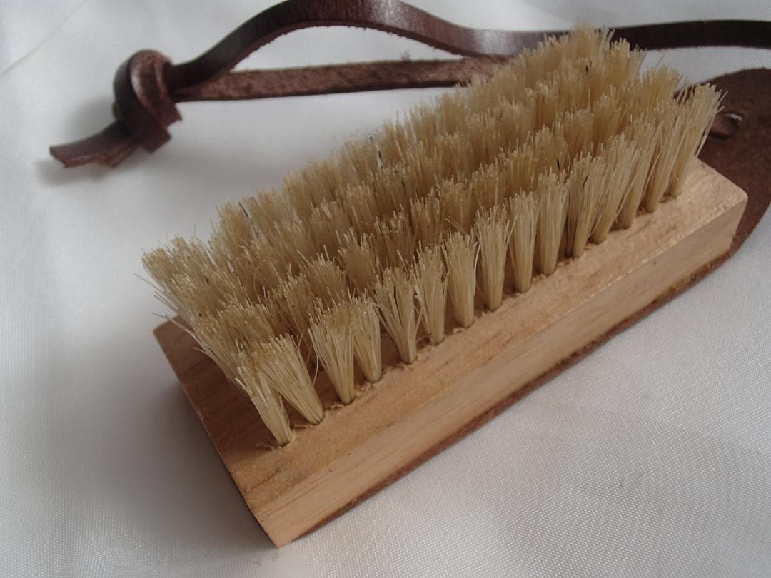 天然毛を使用した小型平型ブラシ、レザー製の持ち手付き
