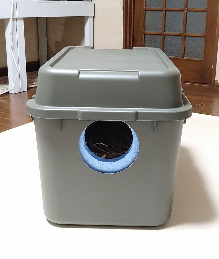 【外猫シェルター(藁付き】 サイズ:外寸(約)幅62×奥行44.3×高さ44.5cm 内寸(約)幅50×奥行34.5×高さ41cm(底部) 冬の寒さをしのぐためのシェルターです。 屋外用なので、耐久性があり、丈夫です。 発泡スチロールの中はとても温かく、 私が今まで調べた中で暖を取るには一番最適です。 しかし発泡スチロールだけでは軽くてもろいため、 外側を丈夫なプラスチックのケースで二重にしました。 こうすることで、カラスに突かれたりして壊れてしまうのを防ぐことができますし、何より二重にすることでさらに温かさが増します。 中には藁が入っています。 こちらの商品は藁も入れた状態で発送いたしますので、届いてすぐ使えます。 藁は、時々様子を見て、湿ったりしていたら交換してあげてくださいm(_ _)m 藁はネットでも売っています。 細かく切ってあると猫の身体に刺さるので、長めに切ってあるものの方がいいかもです^_^ ※ブランケットや毛布やタオルは、ダメです。 水分を吸い込み、凍るからです。 藁は水分を吸いにくく、凍りません。 よく、ペットコーナーに売っている天草もダメです。 こちらは藁と間違えないように気をつけてください。 発泡スチロールの蓋は、猫が押し上げてしまうことがあるため、2か所くらいガムテープで止めて下さい。 強風で飛ばないように、 中に重量コンクリート(10センチ)を入れてご使用下さい。 それで穴の高さが合うようにしています。 置き場所に屋根がなければ、出入り口に100円ショップなどで売っている薄いトレイなどをコーキングで付けると良いです。 コーキングもホームセンターで変えますよ^_^