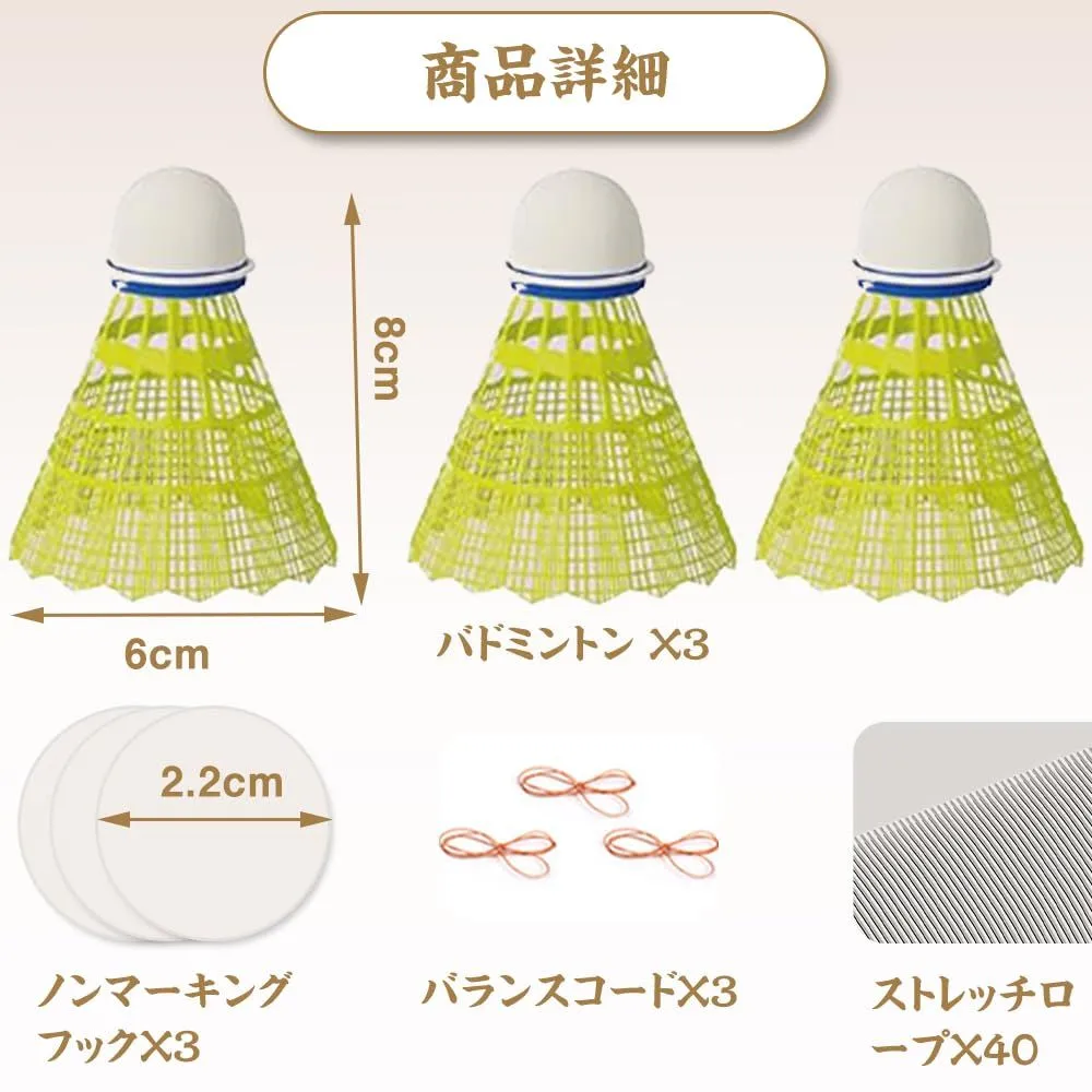 パッケージに含まれるもの:バドミントン X3、ノンマ一キングフックX3、バランスコ一ドX3、ストレッチロプX40。